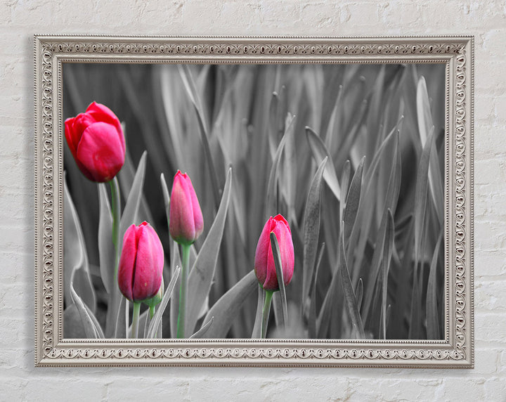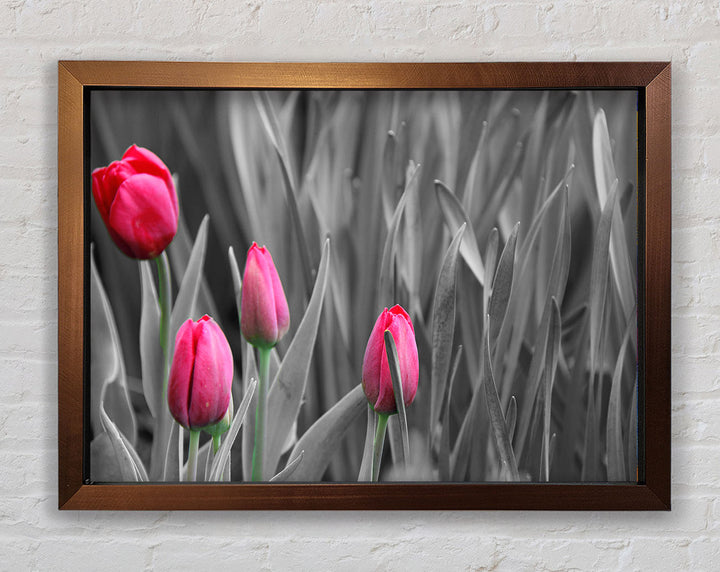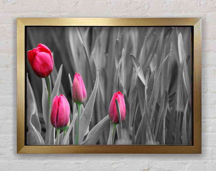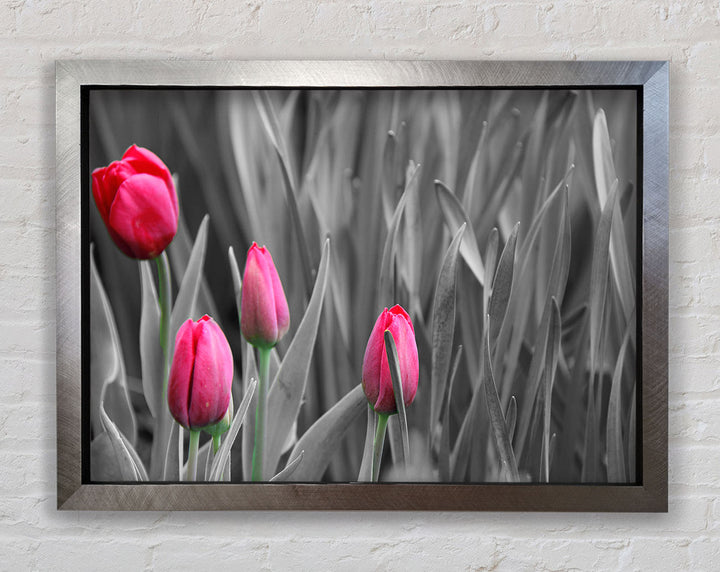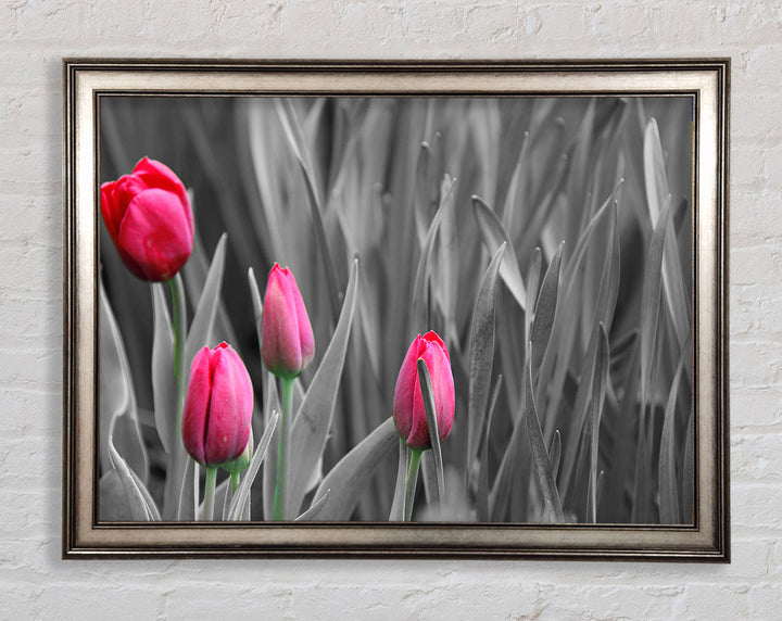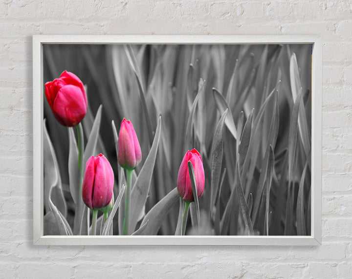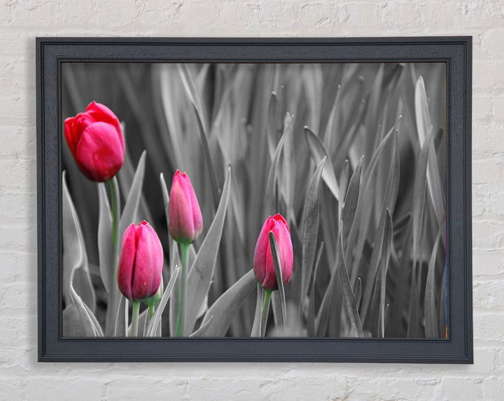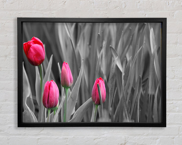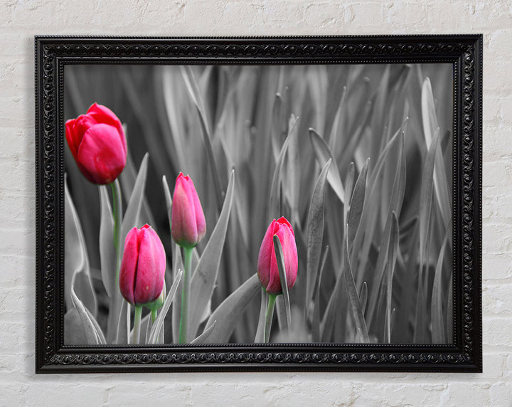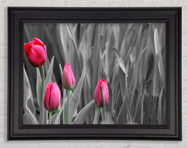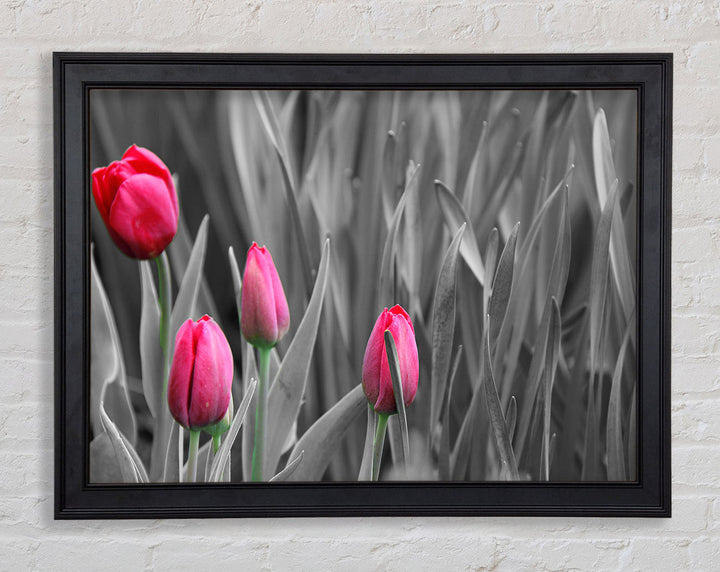 Schwarz-weiß gerahmter Druck mit rosa Tulpen, erhältlich in mehreren Rahmenfarben. Fertig zum Aufhängen aus der Schachtel und handgefertigt im Vereinigten Königreich.