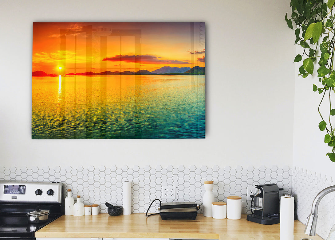 Pinpoint Ocean Sun Acryldruck, UV-gedruckt auf 5 mm dickes Acrylglas. Wird mit allem geliefert, was Sie zum Aufhängen an die Wand brauchen.