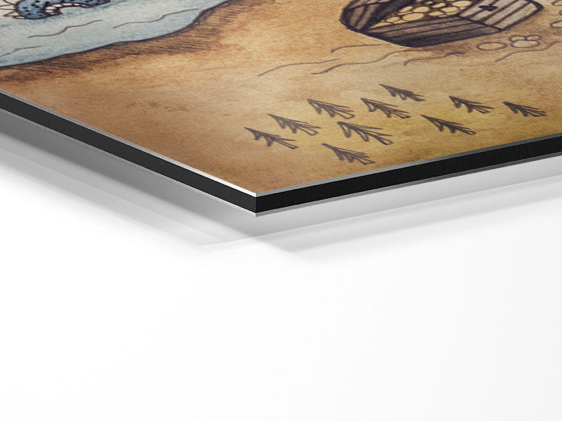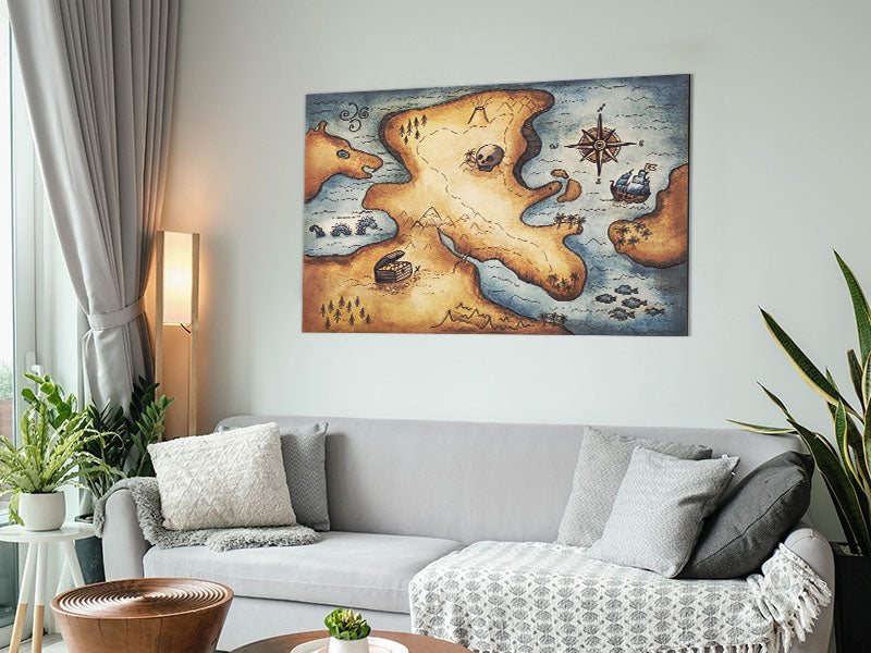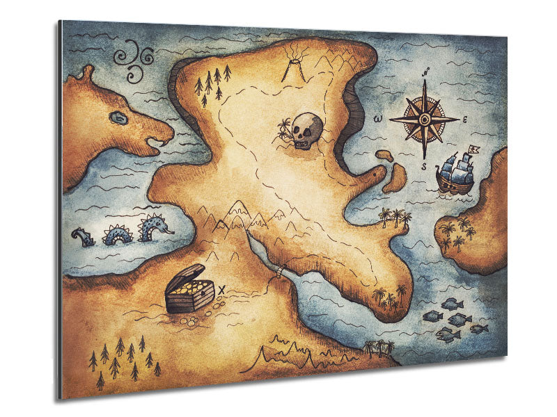 Piratenschatzkarte, gedruckt auf gebürstetem Aluminium-Dibond. Eine moderne Art, Kunst zu präsentieren und leicht zu pflegen.