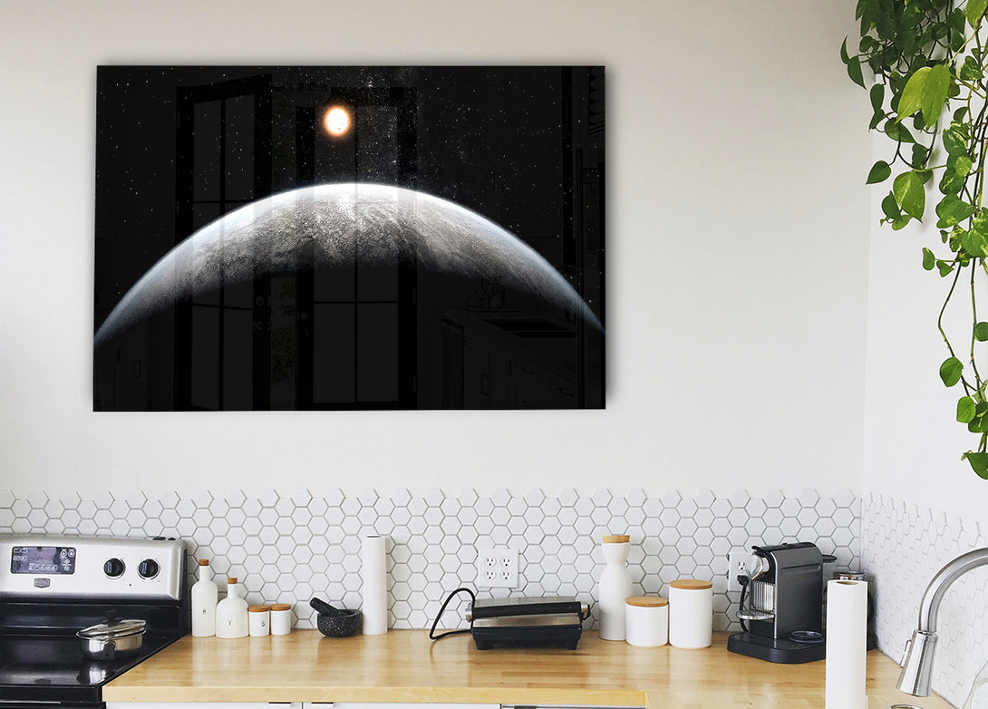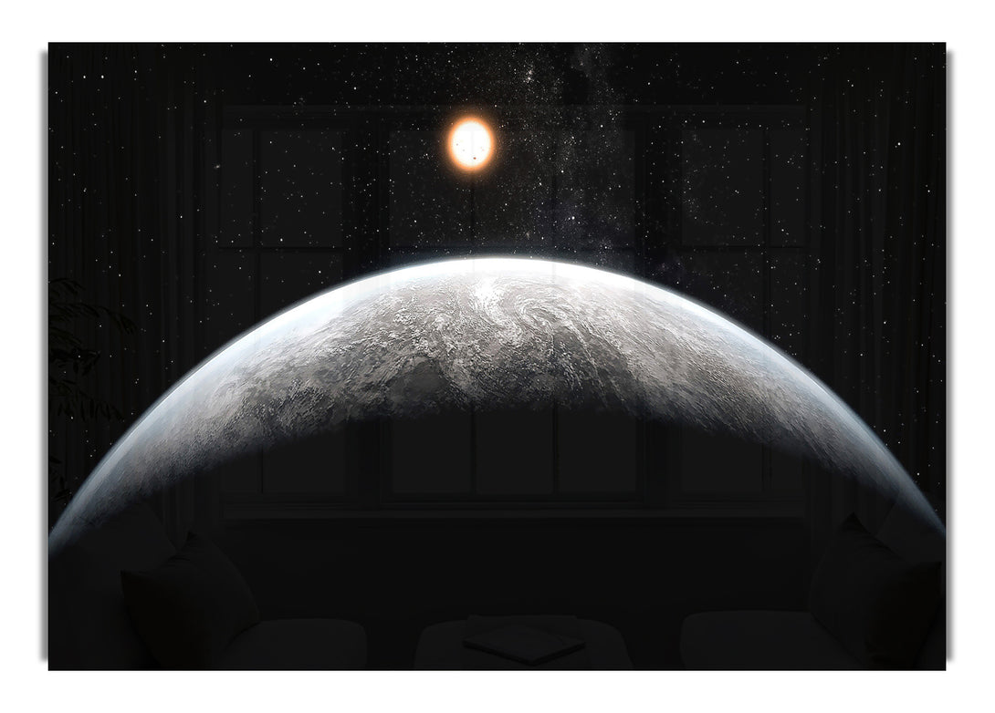 Acryldruck „Planet In The Dark“, UV-gedruckt auf 5 mm dickes Acrylglas. Wird mit allem geliefert, was Sie zum Aufhängen an die Wand brauchen.