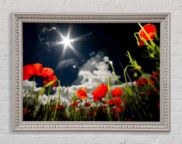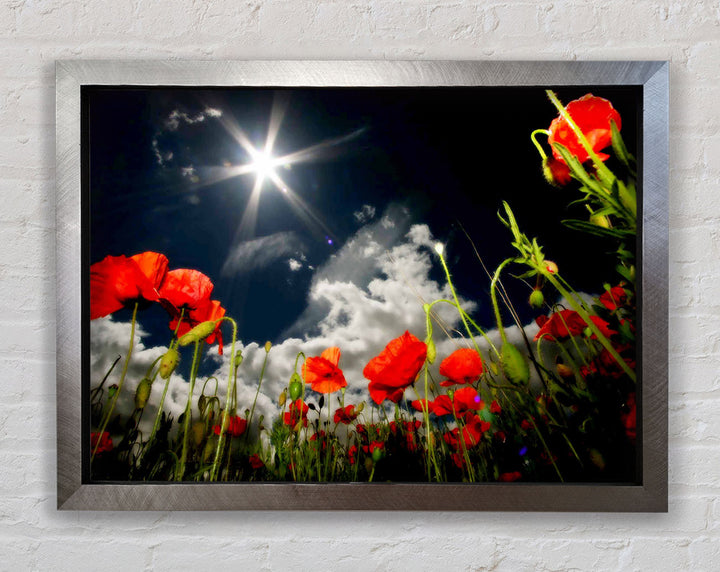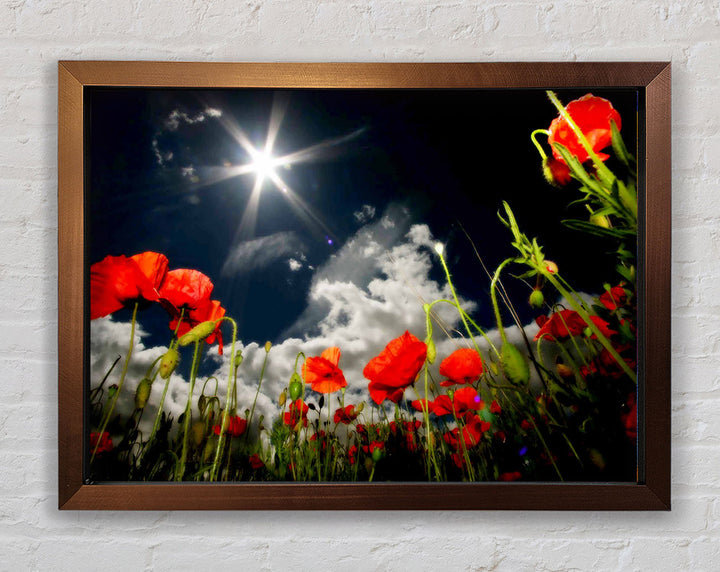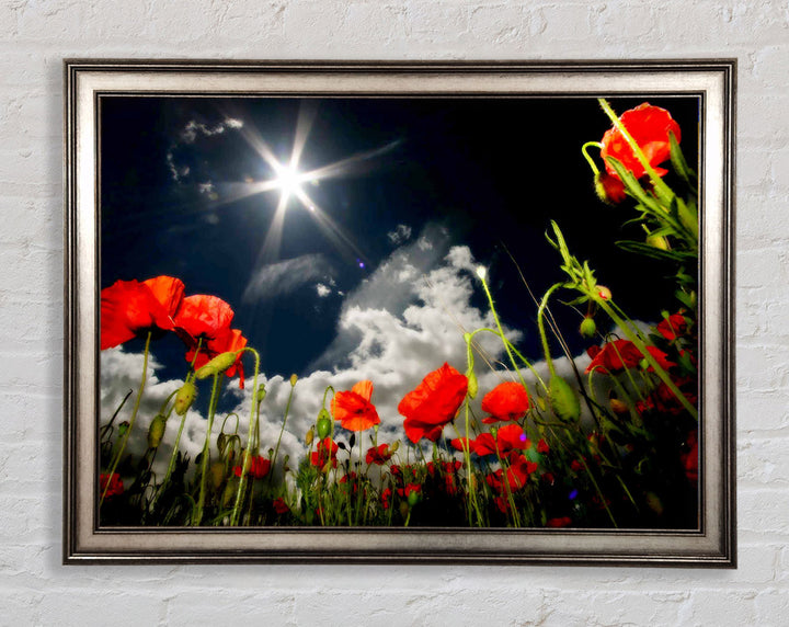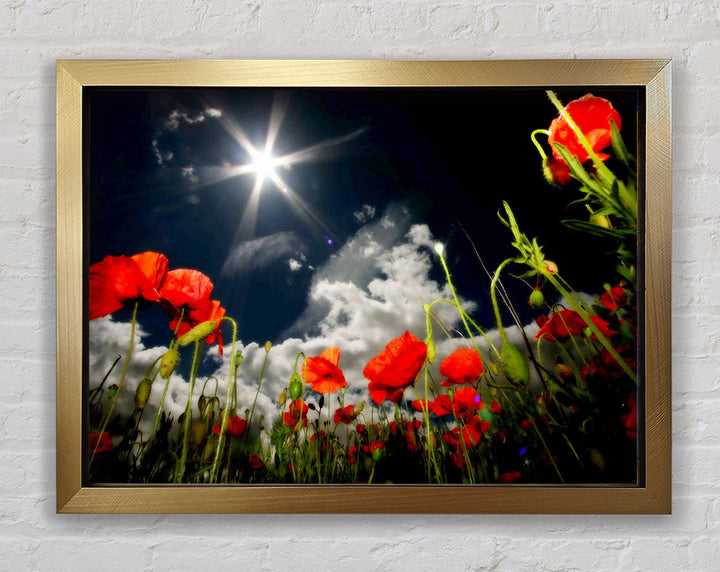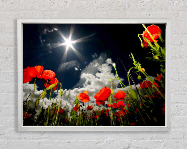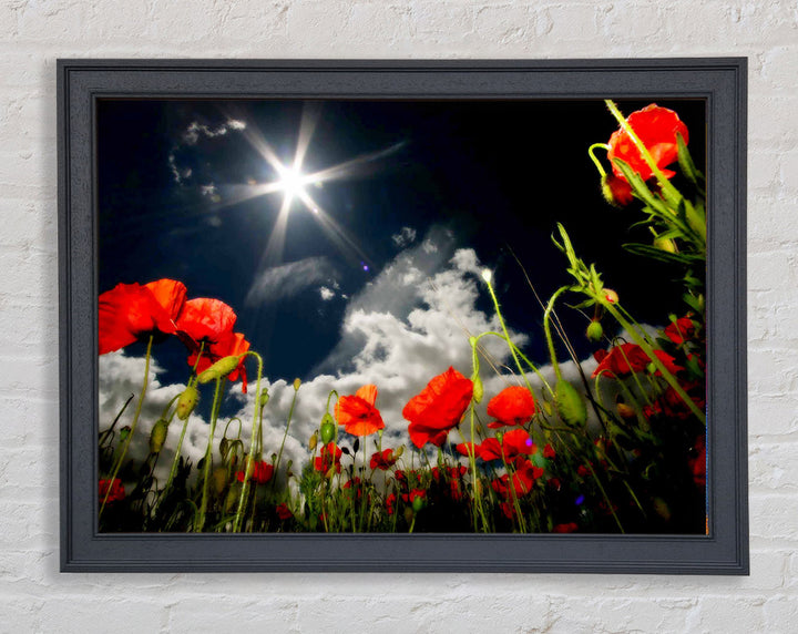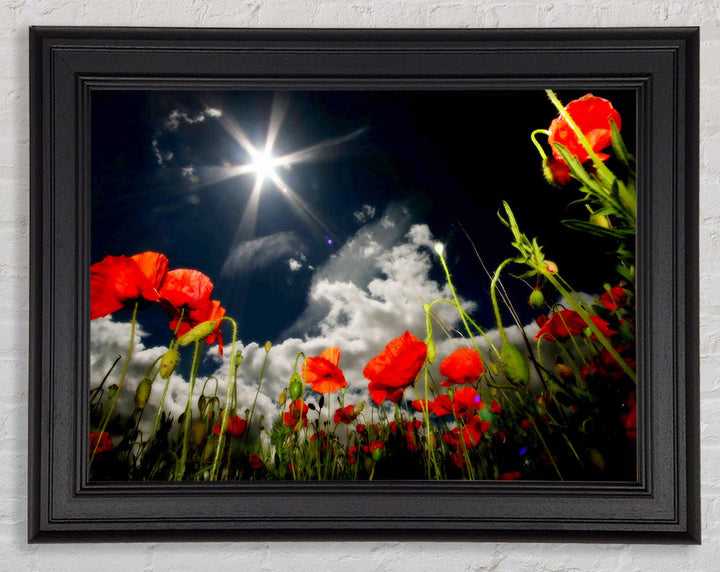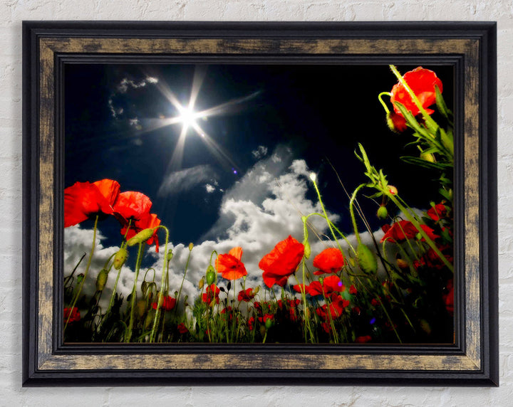 Gerahmter Druck „Poppy Field Sun Star“, erhältlich in mehreren Rahmenfarben. Fertig zum Aufhängen aus der Schachtel und handgefertigt im Vereinigten Königreich.