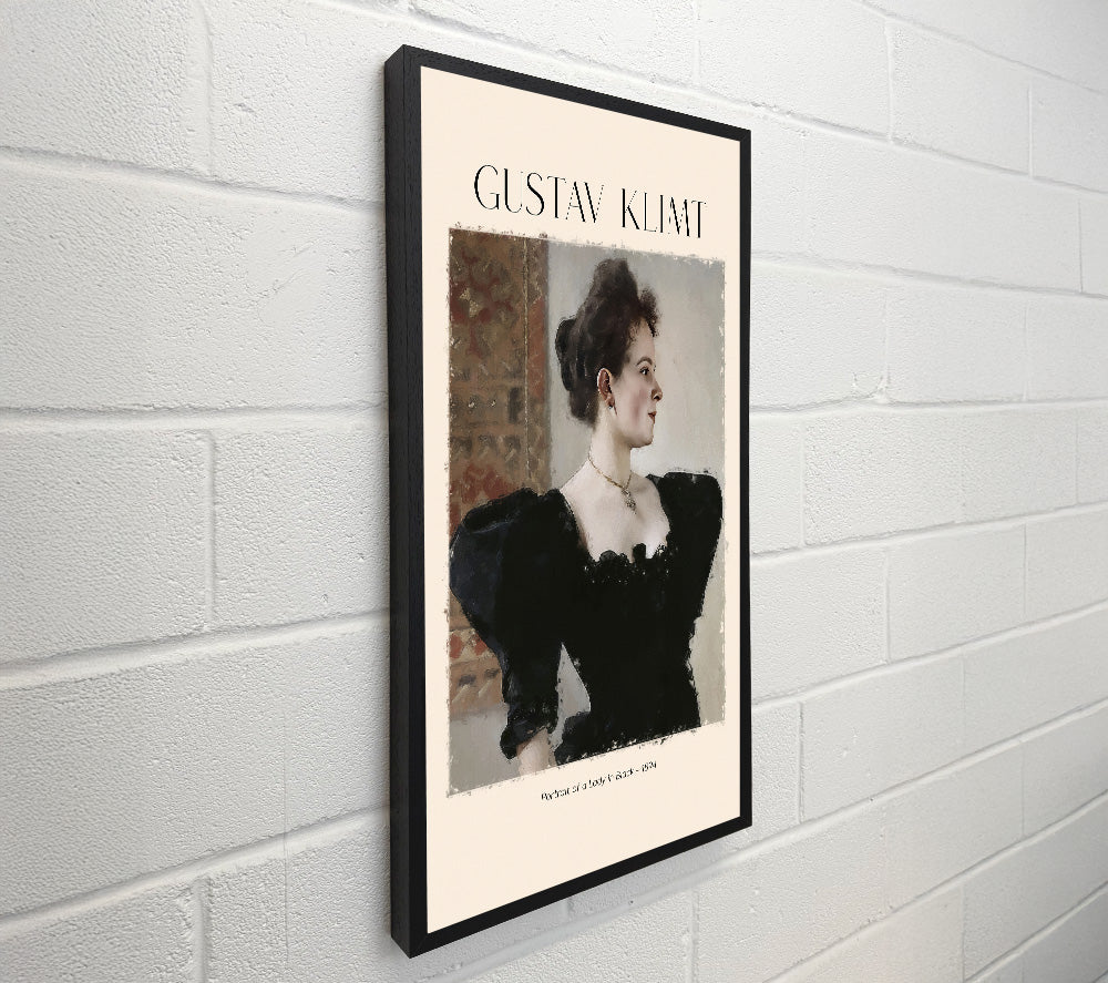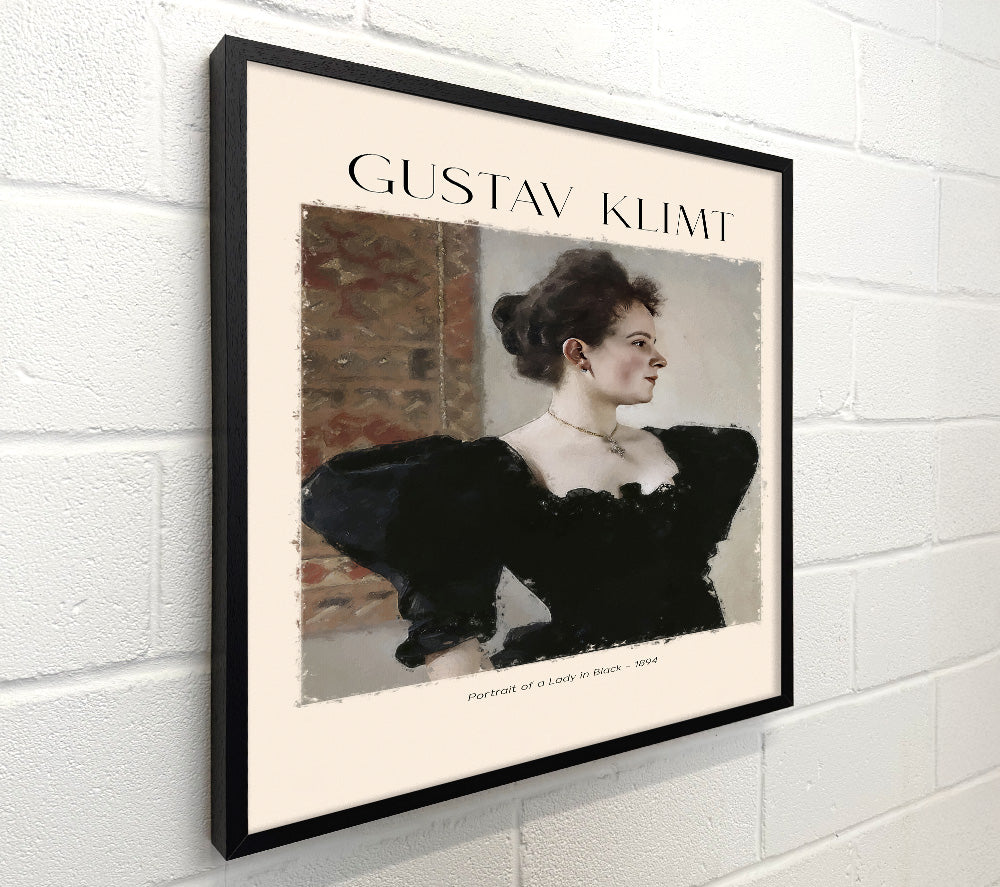 Porträt einer Dame in Schwarz – 1894 von Gustav Klimt, quadratische Leinwand, gedruckt auf beschichteter Polyester-Leinwand. Auf einem 44 mm großen Kastenrahmen montiert, fertig zum Aufhängen.