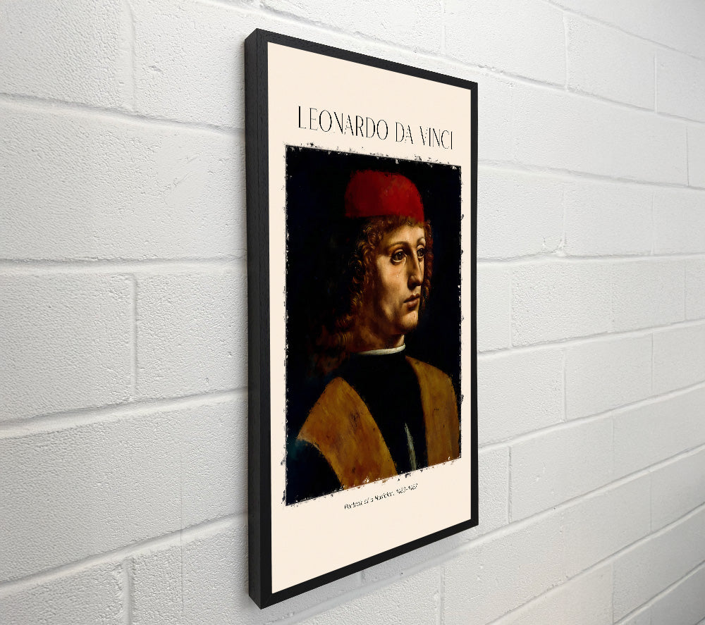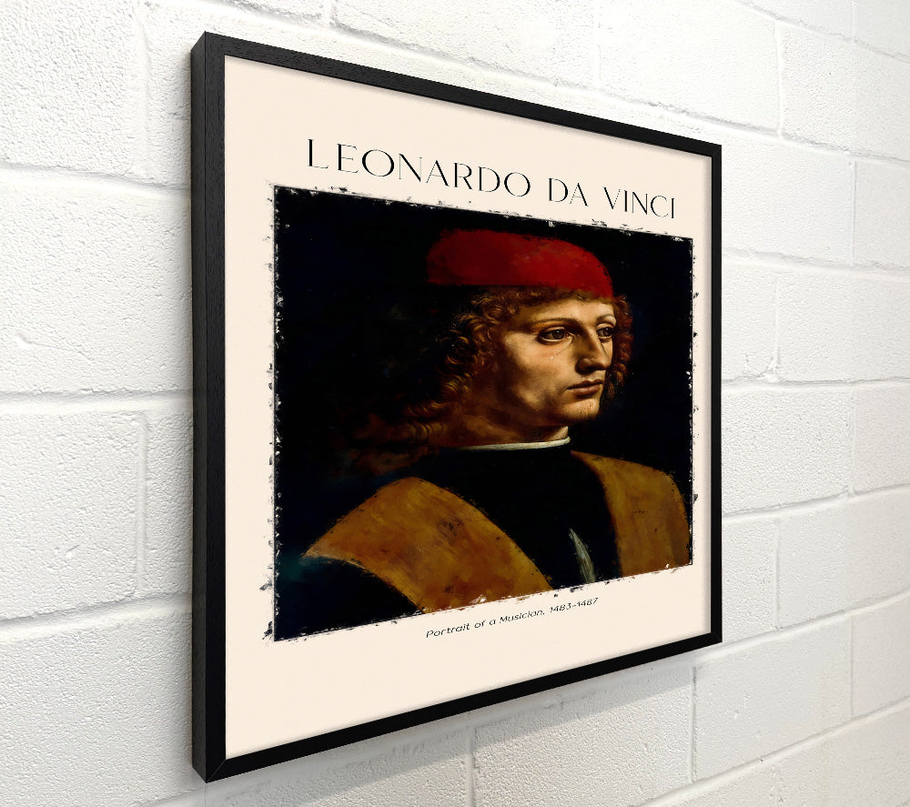 Porträt eines Musikers, 1483–1487 von Fonardo Da Vinci. Quadratische Leinwand, gedruckt auf beschichteter Polyester-Leinwand. Auf einem 44 mm breiten Kastenrahmen montiert, fertig zum Aufhängen.