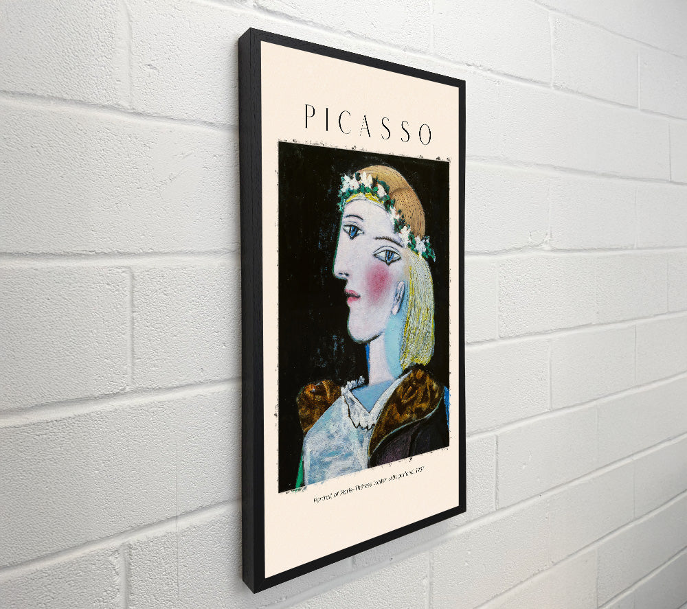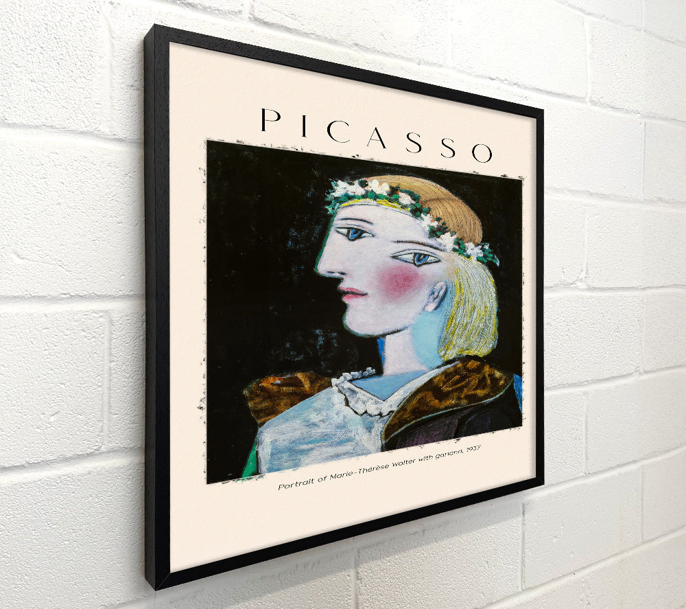 Porträt von Marie-Thérèse Walter mit Girlande, 1937 von Picasso. Quadratische Leinwand, gedruckt auf beschichteter Polyester-Leinwand. Auf einem 44 mm breiten Rahmen montiert, fertig zum Aufhängen.
