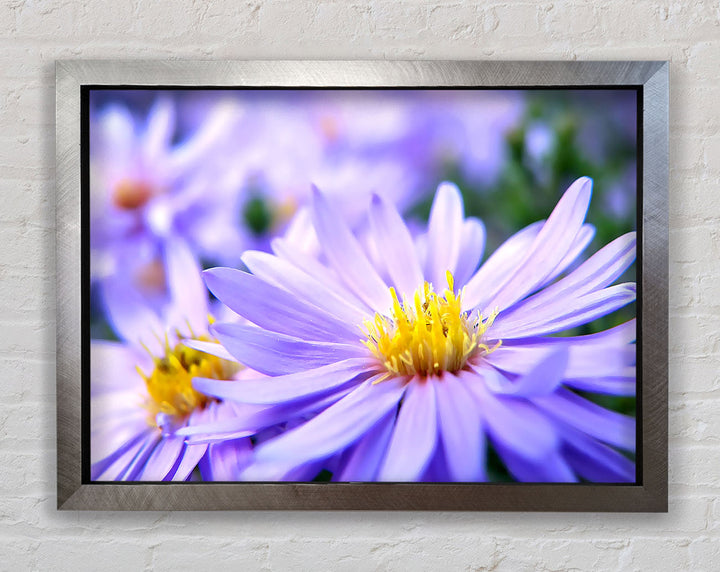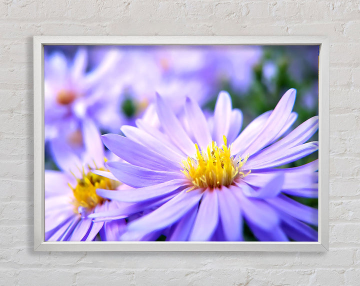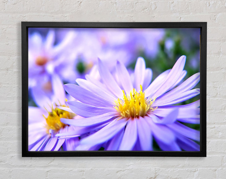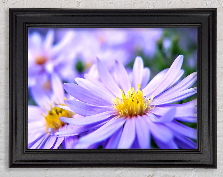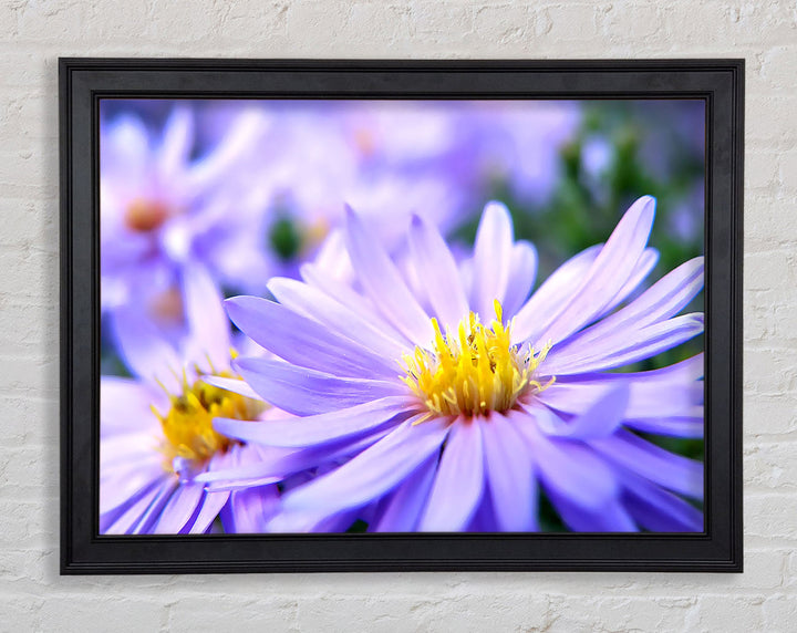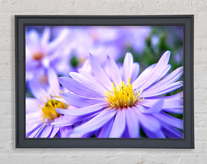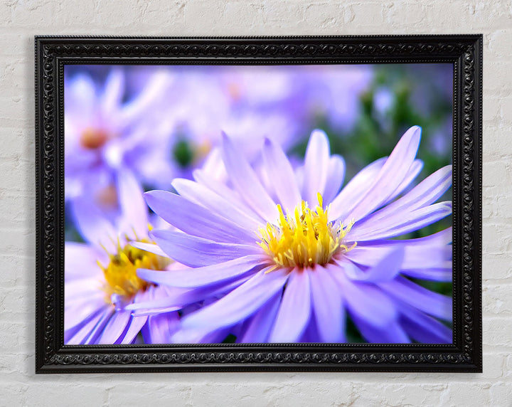 Hübscher gerahmter Druck mit violetten Blumen, erhältlich in mehreren Rahmenfarben. Fertig zum Aufhängen aus der Schachtel und handgefertigt im Vereinigten Königreich.