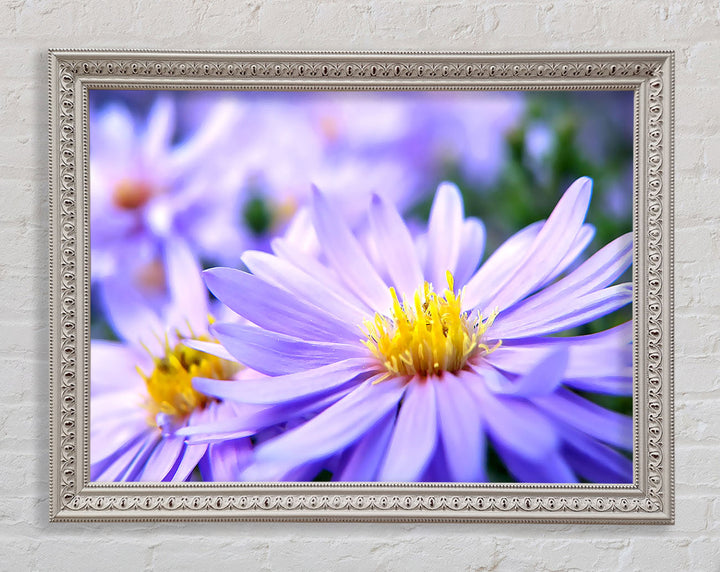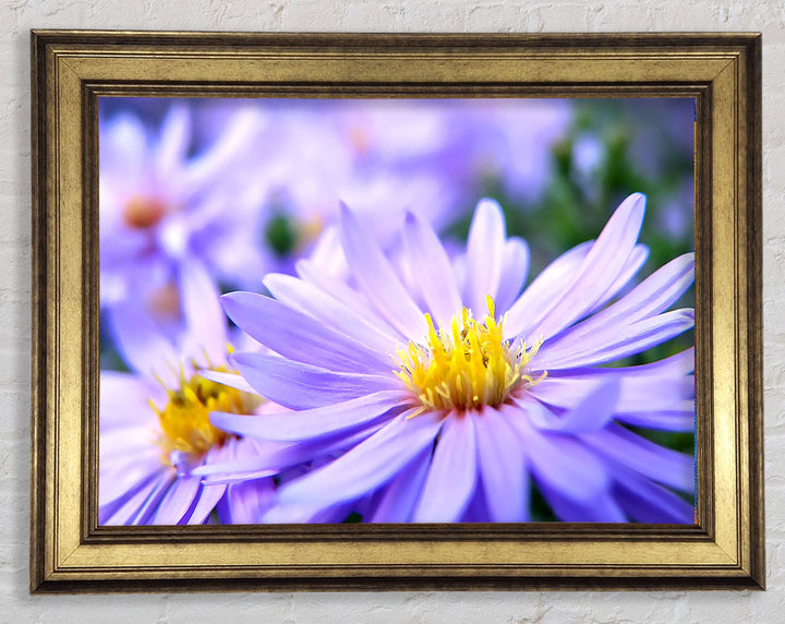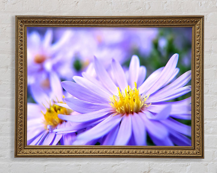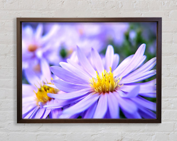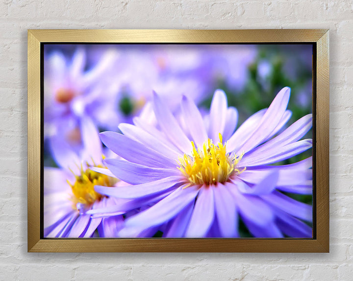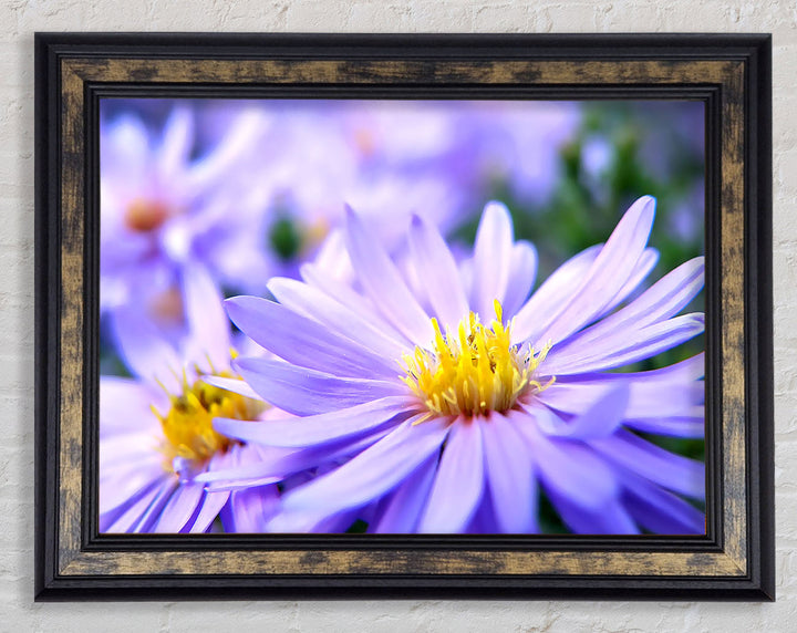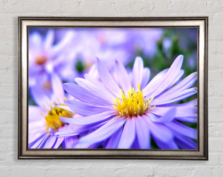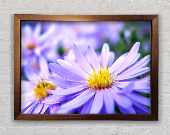 Hübscher gerahmter Druck mit violetten Blumen, erhältlich in mehreren Rahmenfarben. Fertig zum Aufhängen aus der Schachtel und handgefertigt im Vereinigten Königreich.