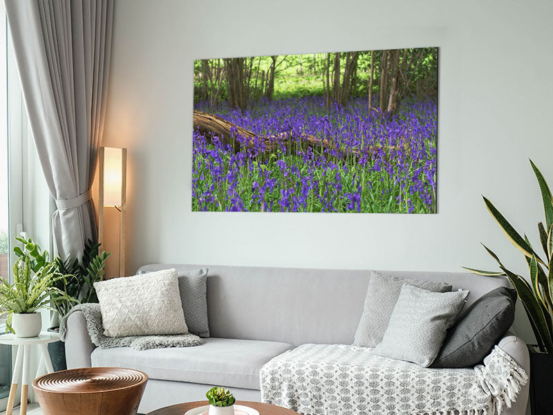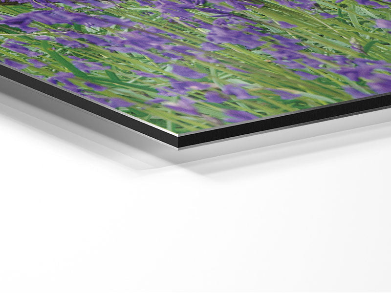 Lila Blumen auf der Wiese Gedruckt auf gebürstetem Aluminium-Dibond. Eine moderne Art, Kunst zu präsentieren und leicht zu pflegen.