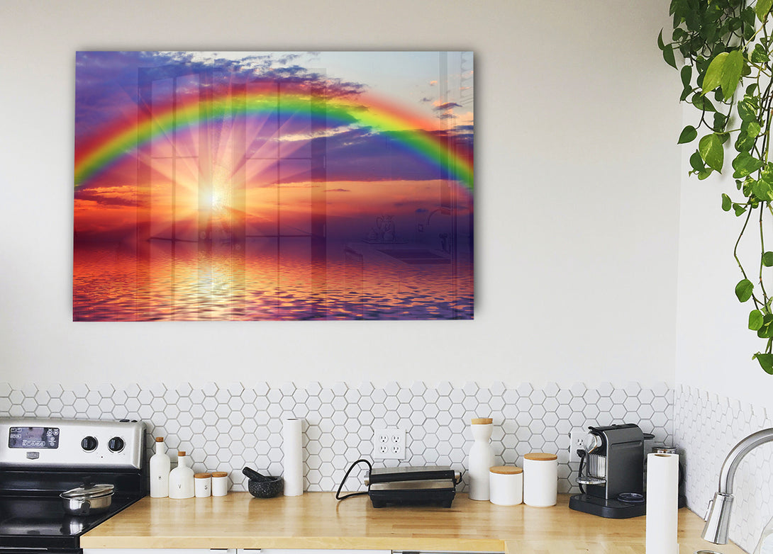 Acryldruck „Rainbow Sun Blaze“, UV-gedruckt auf 5 mm dickes Acrylglas. Wird mit allem geliefert, was Sie zum Aufhängen an die Wand brauchen.