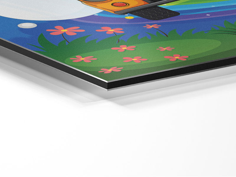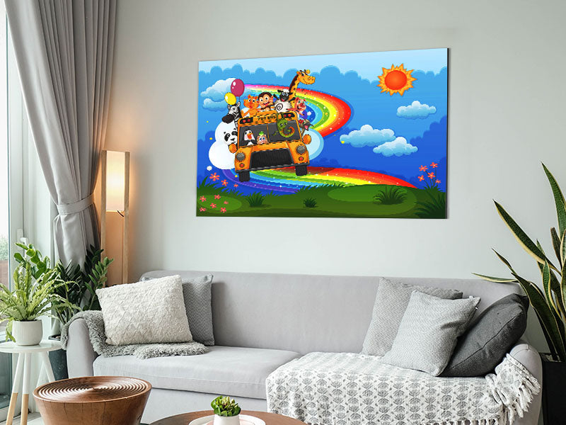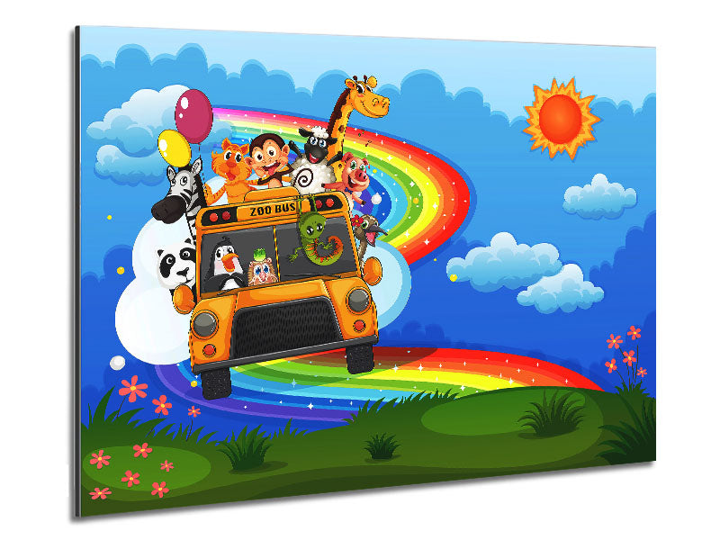 Regenbogen-Zoobus, gedruckt auf gebürstetem Aluminium-Dibond. Eine moderne Art, Kunst zu präsentieren und leicht zu pflegen.
