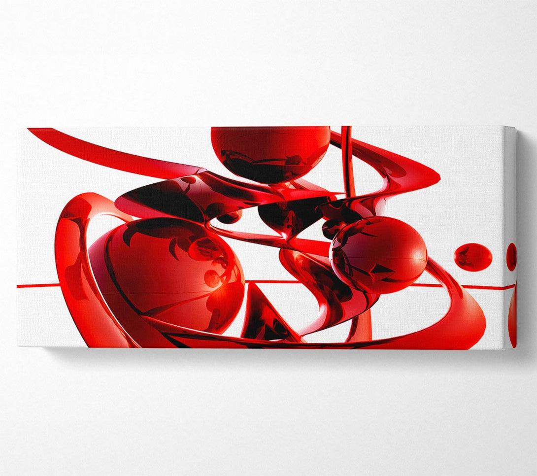 Spiralförmige Leinwand mit roten Bällen, gedruckt auf beschichteter Polyester-Leinwand. Auf einem 44 mm breiten Kastenrahmen montiert, fertig zum Aufhängen.