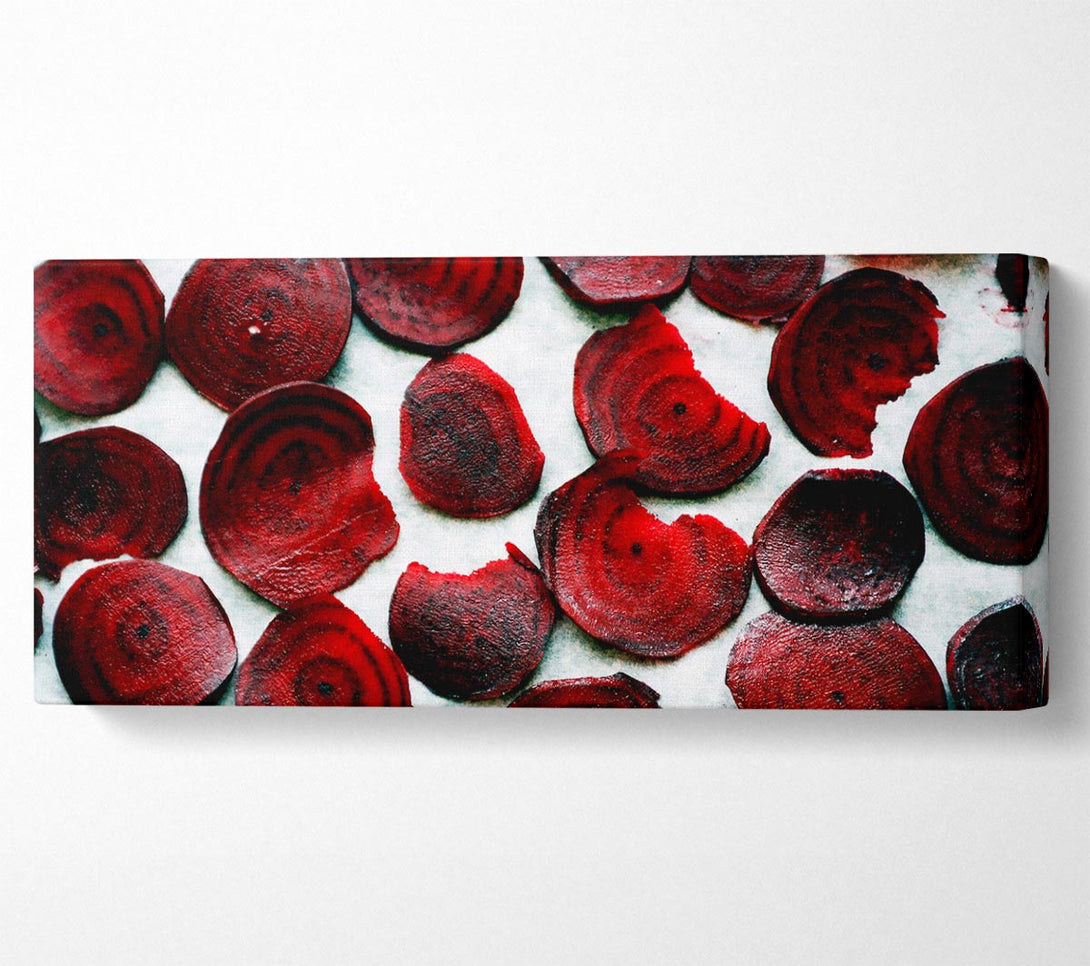 Leinwandbild mit roten Rote-Beete-Scheiben, gedruckt auf beschichtetem Polyester-Canvas. Auf einem 44 mm breiten Kastenrahmen montiert, fertig zum Aufhängen.