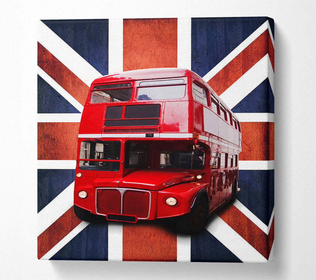 Leinwandbild „Roter Bus auf britischer Flagge“, gedruckt auf beschichtetem Polyester-Canvas. Auf einem 44 mm großen Kastenrahmen montiert, fertig zum Aufhängen.