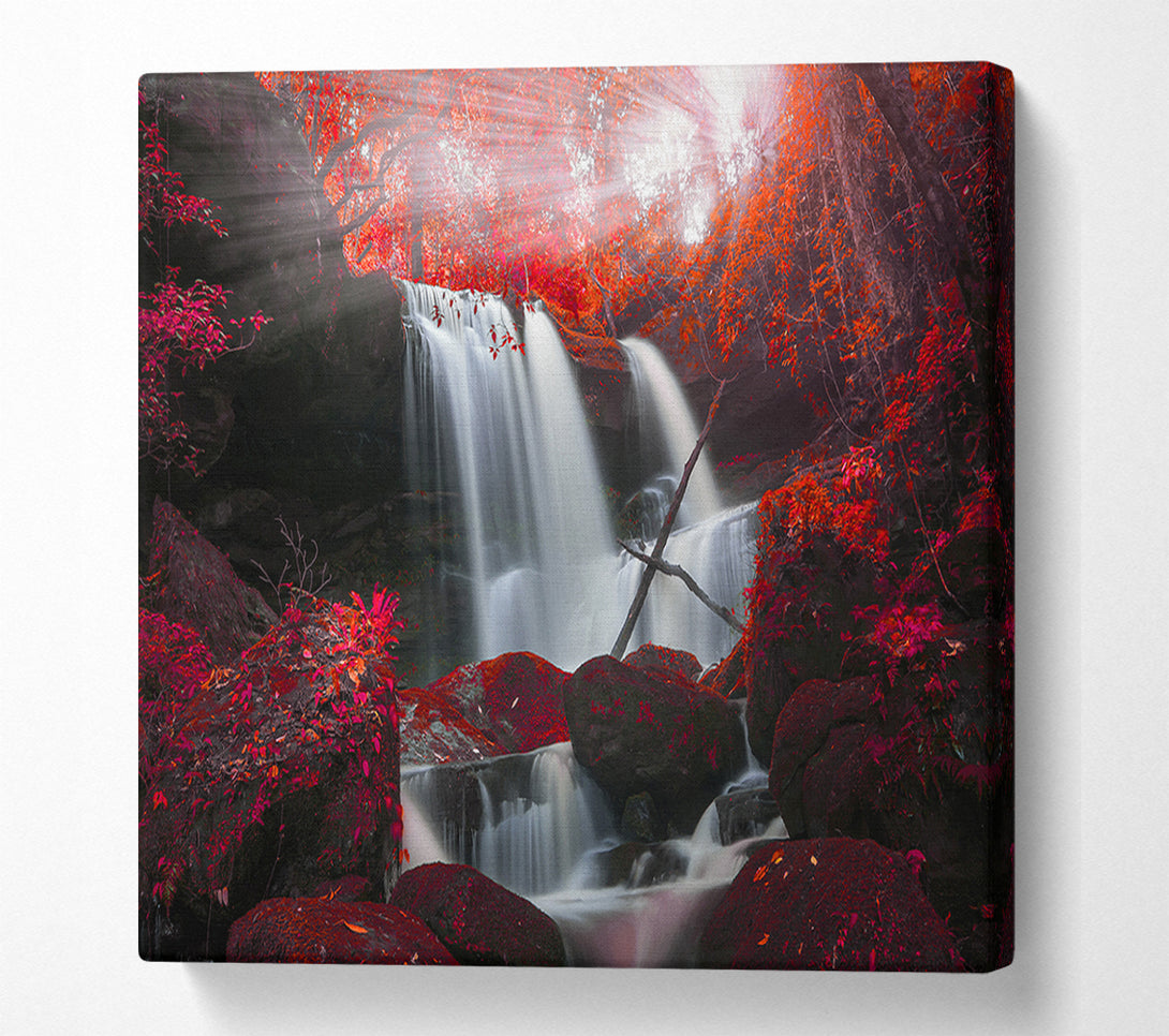Leinwandbild „Red Forest Waterfall Delight“, gedruckt auf beschichteter Polyester-Leinwand. Auf einem 44 mm großen Kastenrahmen montiert, fertig zum Aufhängen.