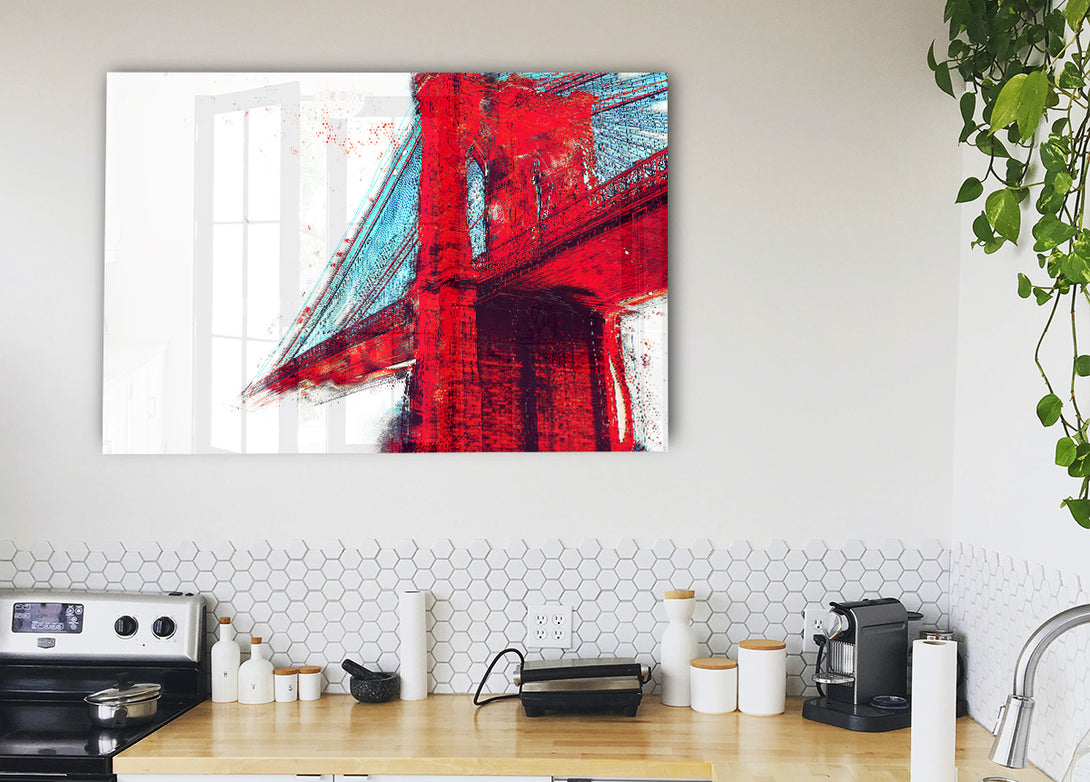 Roter Funky Brooklyn Bridge-Acryldruck, UV-gedruckt auf 5 mm dickes Acrylglas. Wird mit allem geliefert, was Sie zum Aufhängen an Ihre Wand benötigen.
