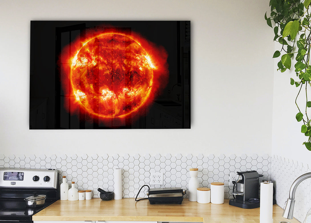Acryldruck „Red Sun Fire Glow“, UV-gedruckt auf 5 mm dickes Acrylglas. Wird mit allem geliefert, was Sie zum Aufhängen an die Wand brauchen.