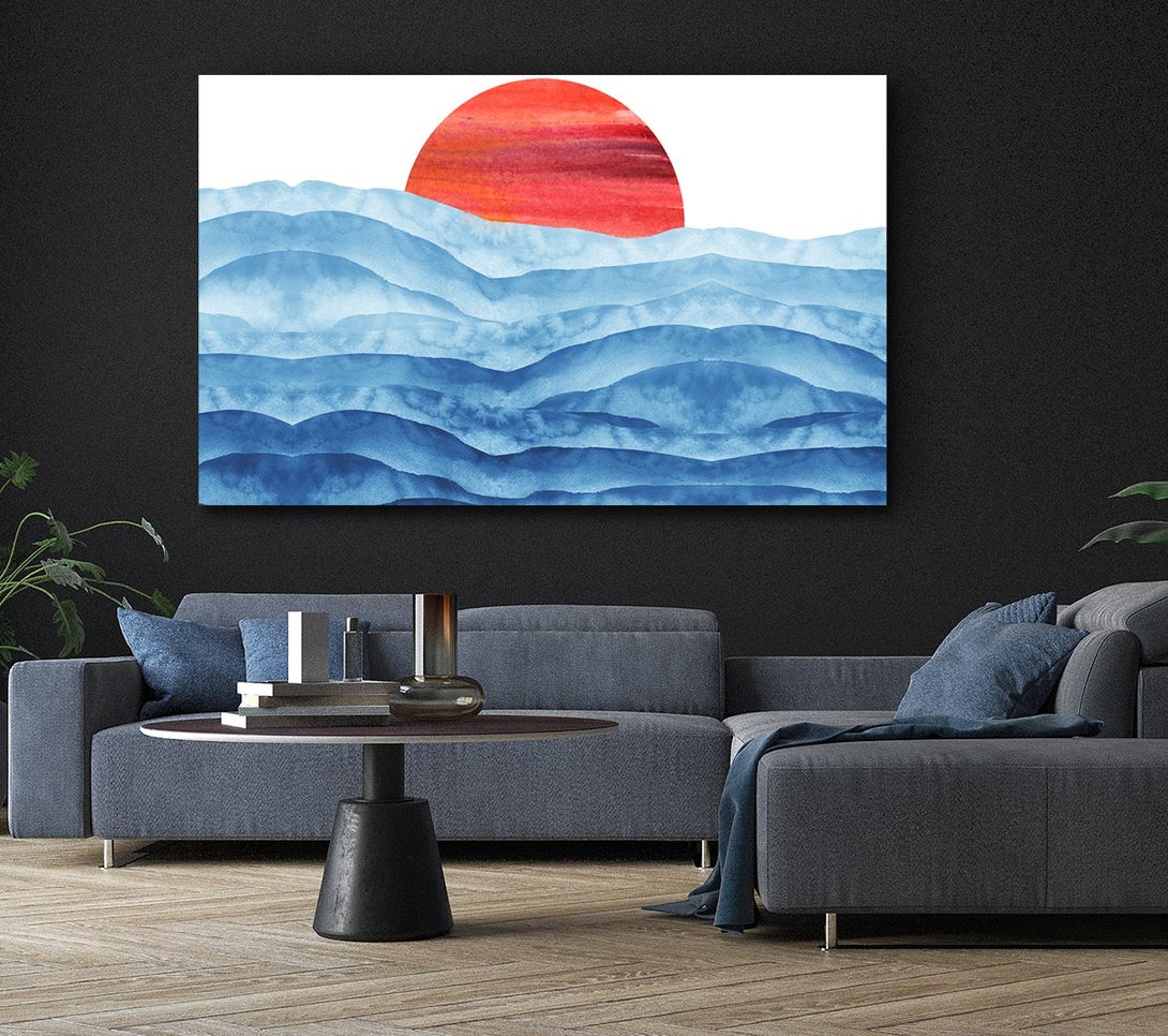 Leinwandbild „Red Sun Over The Ripples“, gedruckt auf beschichtetem Polyester-Canvas. Auf einem 44 mm großen Kastenrahmen montiert, fertig zum Aufhängen.