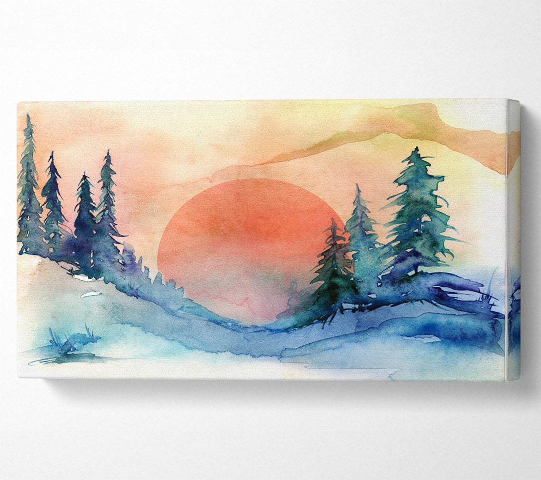 Breite Leinwand „Red Winter Sun“, gedruckt auf beschichteter Polyester-Leinwand. Auf einem 44 mm breiten Kastenrahmen montiert, fertig zum Aufhängen.
