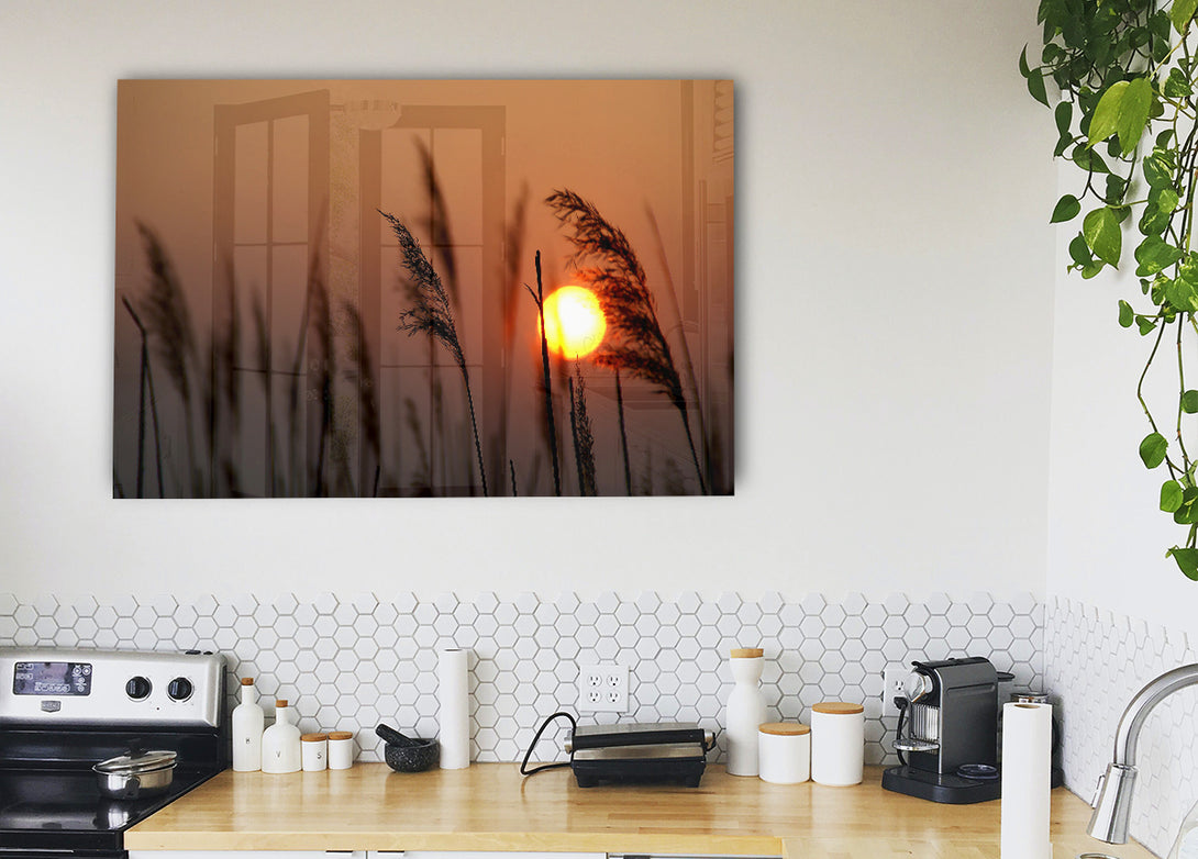 Acryldruck „Reed Silhouette At Sunset“, UV-gedruckt auf 5 mm dickes Acrylglas. Wird mit allem geliefert, was Sie zum Aufhängen an die Wand brauchen.