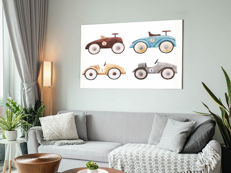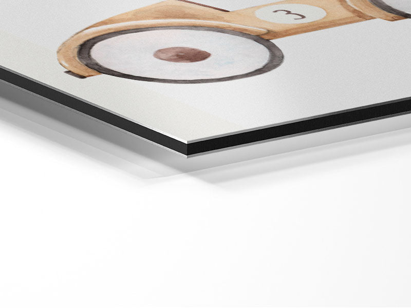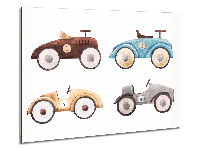 Retro-Rutschautos. Gedruckt auf gebürstetem Aluminium-Dibond. Eine moderne Art, Kunst zu präsentieren und leicht zu pflegen.
