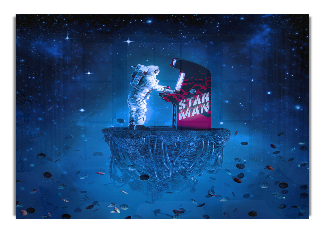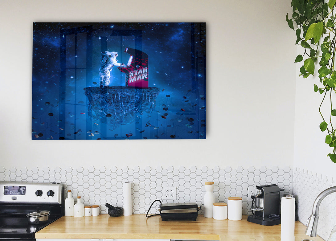Acryldruck „Rocketman Playing Games“, UV-Druck auf 5 mm dickes Acrylglas. Wird mit allem geliefert, was Sie zum Aufhängen an die Wand brauchen.