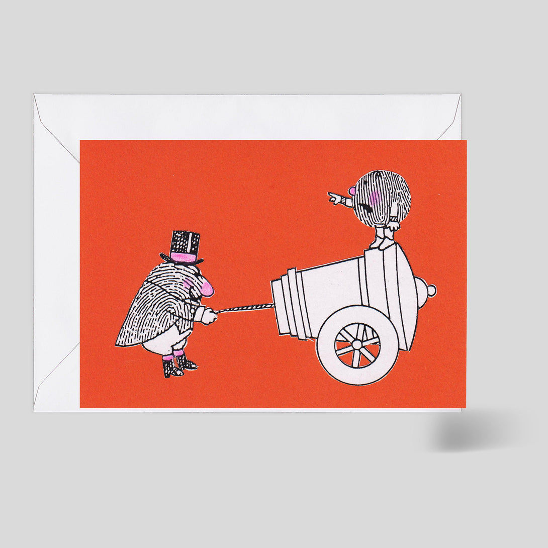 Rodney Peppé (1934 - 2022) was a British author and illustrator in the children's fiction and crafts genres. He was the author and illustrator of more than 80 children's books, publishing his first children's book in 1968 The Alphabet Book with Constable Young Books. Rodney made these images for Art on a Postcard in 2015/2016. His thumbprint characters had been a motive of his since the 1960s.