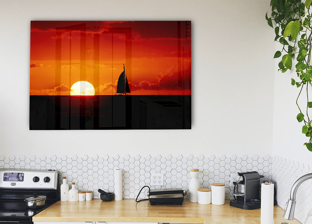 Acryldruck „Segelboot-Sonnenuntergang“, UV-gedruckt auf 5 mm dickes Acrylglas. Wird mit allem geliefert, was Sie zum Aufhängen an die Wand brauchen.