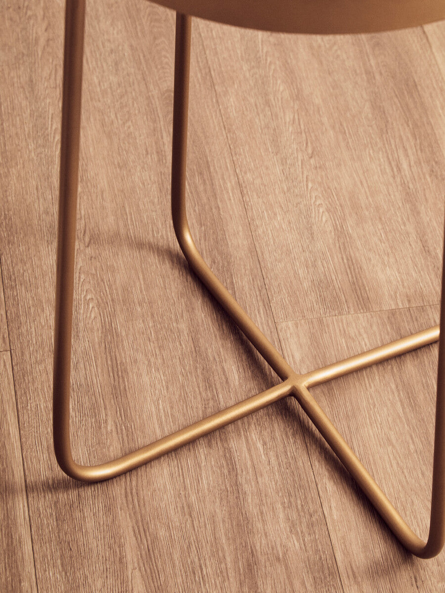 Its base is crafted from strong iron and has a warm gold slightly distressed texture, the legs intersect at the base to produce a flowing silhouette , its round top is made from solid marble, and has a white colour flecked with darker wisps and veins. It styles well with luxe furniture and accessories