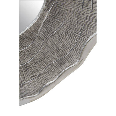 This large round wall mirror is a chic decorative accent for contemporary and modern walls complementing reflective and metallic decor accessories in the room. This modern wall mirror is made from durable aluminium with an antique silver finish that coordinates with he reflective mirror inside. The oak wood effect of the frame has undulating edges that further enhances the organic aspect.