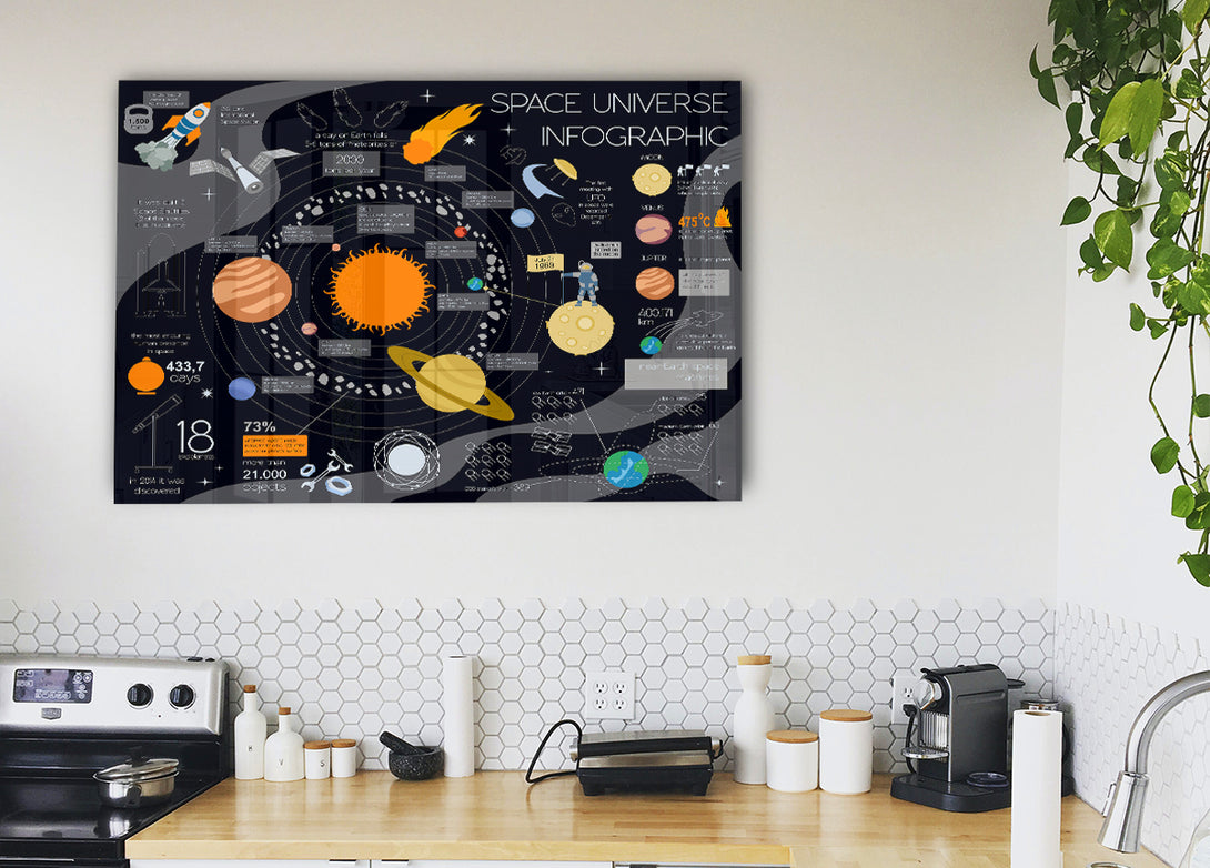 Acryldruck „Weltraumuniversum-Infografik“, UV-gedruckt auf 5 mm dickes Acrylglas. Wird mit allem geliefert, was Sie zum Aufhängen an die Wand brauchen.