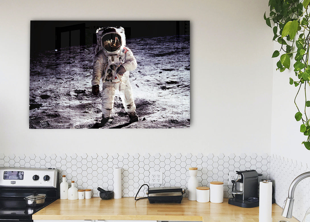 Acryldruck „Spaceman On The Moon“, UV-gedruckt auf 5 mm dickes Acrylglas. Wird mit allem geliefert, was Sie zum Aufhängen an die Wand brauchen.