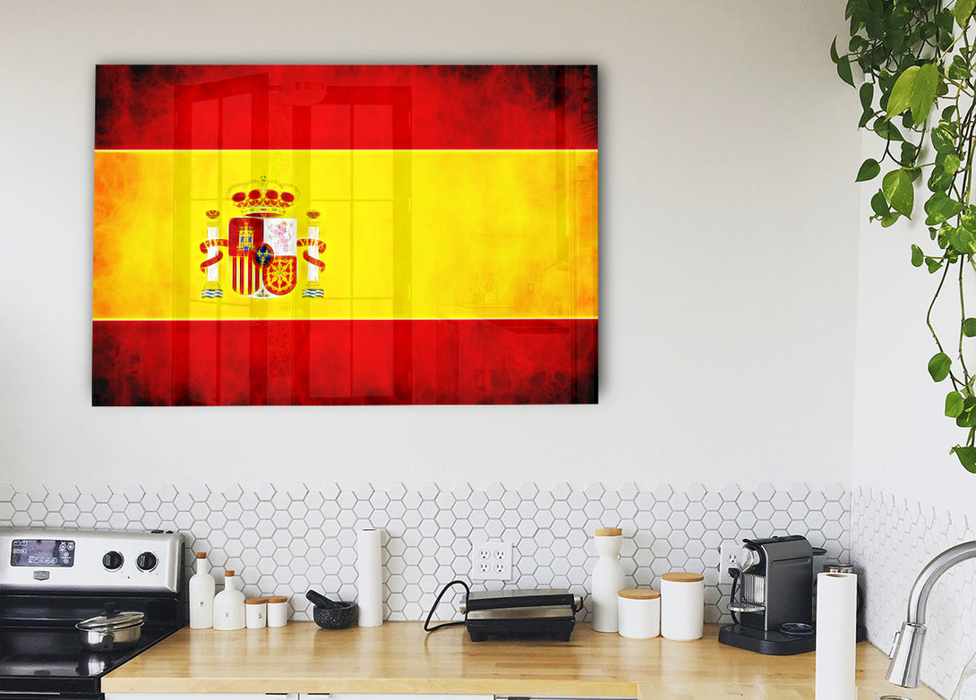 Acryldruck mit spanischer Flagge, UV-Druck auf 5 mm dickes Acrylglas. Wird mit allem geliefert, was Sie zum Aufhängen an die Wand benötigen.