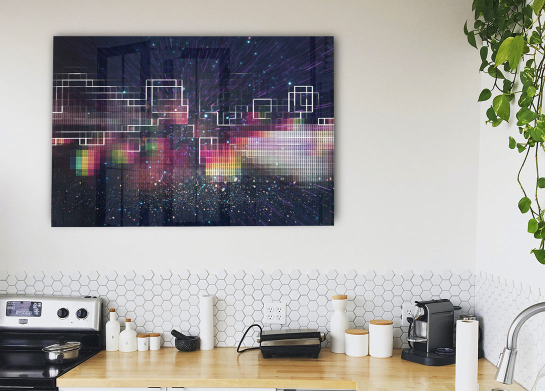 Acryldruck „Squares Of The Universe“, UV-gedruckt auf 5 mm dickes Acrylglas. Wird mit allem geliefert, was Sie zum Aufhängen an Ihrer Wand benötigen.