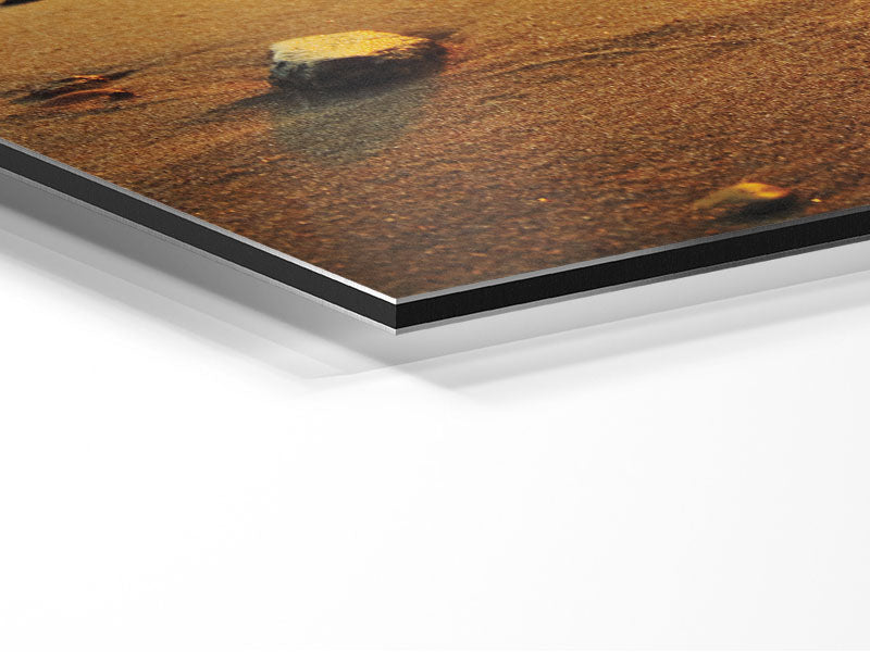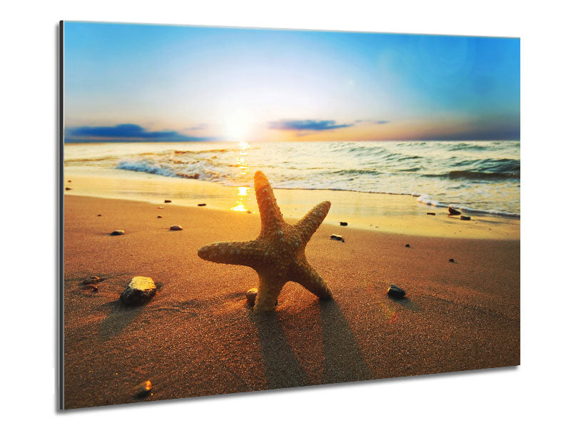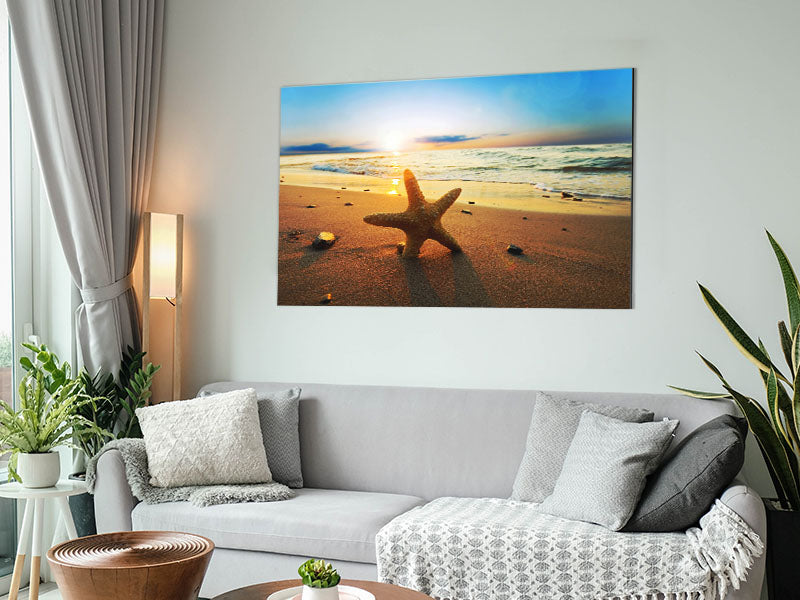 Seestern-Sonnenschein. Gedruckt auf gebürstetem Aluminium-Dibond. Eine moderne Art, Kunst zu präsentieren und leicht zu pflegen.