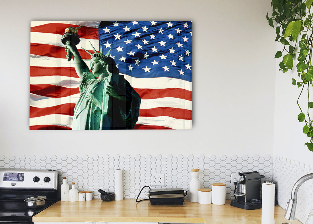 Acryldruck „Stars and Stripes With Lady Liberty“, UV-gedruckt auf 5 mm dickes Acrylglas. Wird mit allem geliefert, was Sie zum Aufhängen an die Wand brauchen.