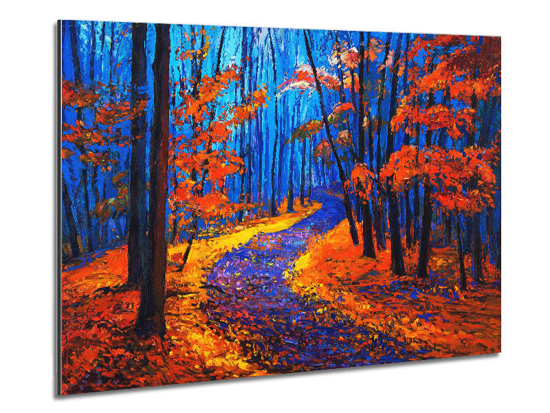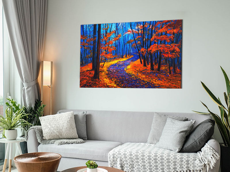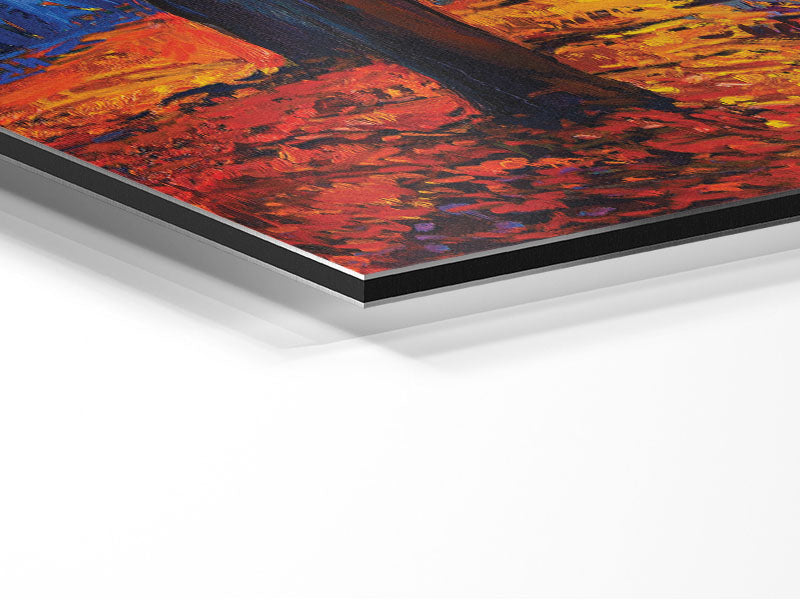 Atemberaubender Herbstspaziergang. Gedruckt auf gebürstetem Aluminium-Dibond. Eine moderne Art, Kunst zu präsentieren und leicht zu pflegen.