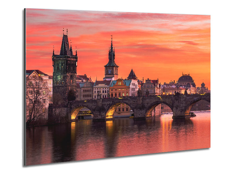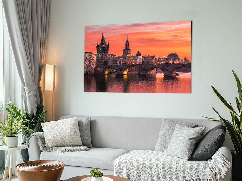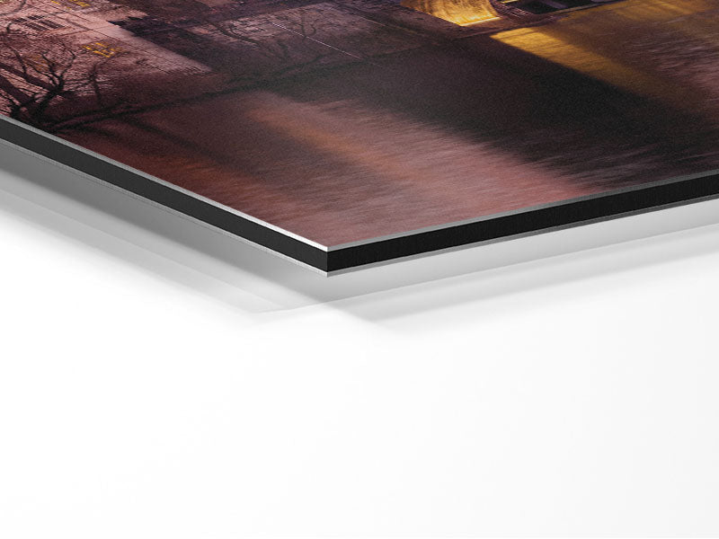 Atemberaubender rosa Himmel über der Stadt. Gedruckt auf gebürstetem Aluminium-Dibond. Eine moderne Art, Kunst zu präsentieren und leicht zu pflegen.