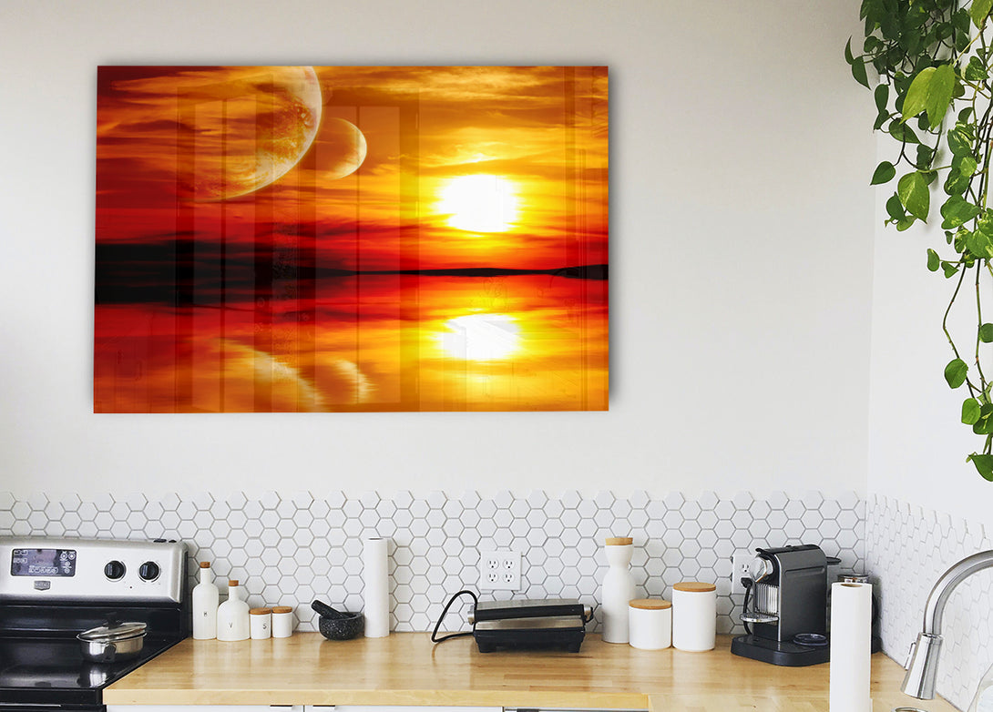 Atemberaubender Planet Sunset-Acryldruck, UV-gedruckt auf 5 mm dickes Acrylglas. Wird mit allem geliefert, was Sie zum Aufhängen an Ihre Wand benötigen.