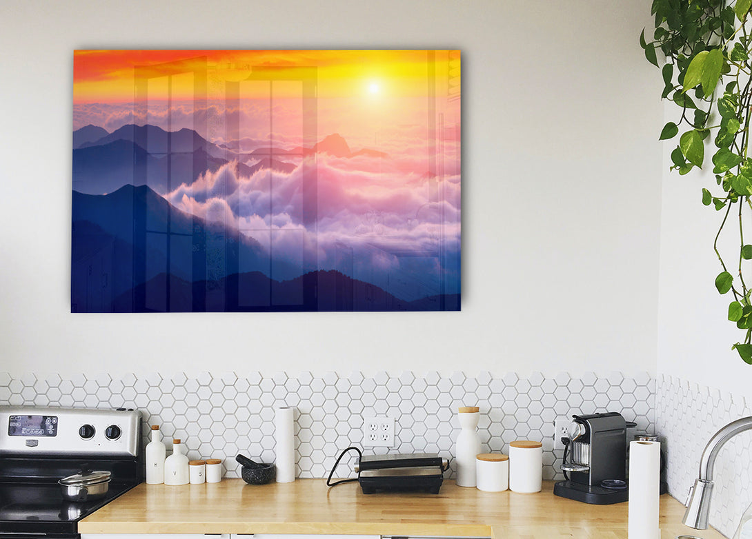 Acryldruck „Sonne über den Bergwolken“, UV-Druck auf 5 mm dickes Acrylglas. Wird mit allem geliefert, was Sie zum Aufhängen an Ihre Wand benötigen.