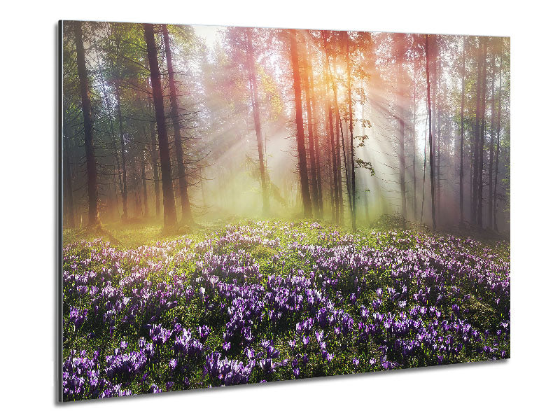 Sonne durch den Wald mit Glockenblumen. Gedruckt auf gebürstetem Aluminium-Dibond. Eine moderne Art, Kunst zu präsentieren und leicht zu pflegen.