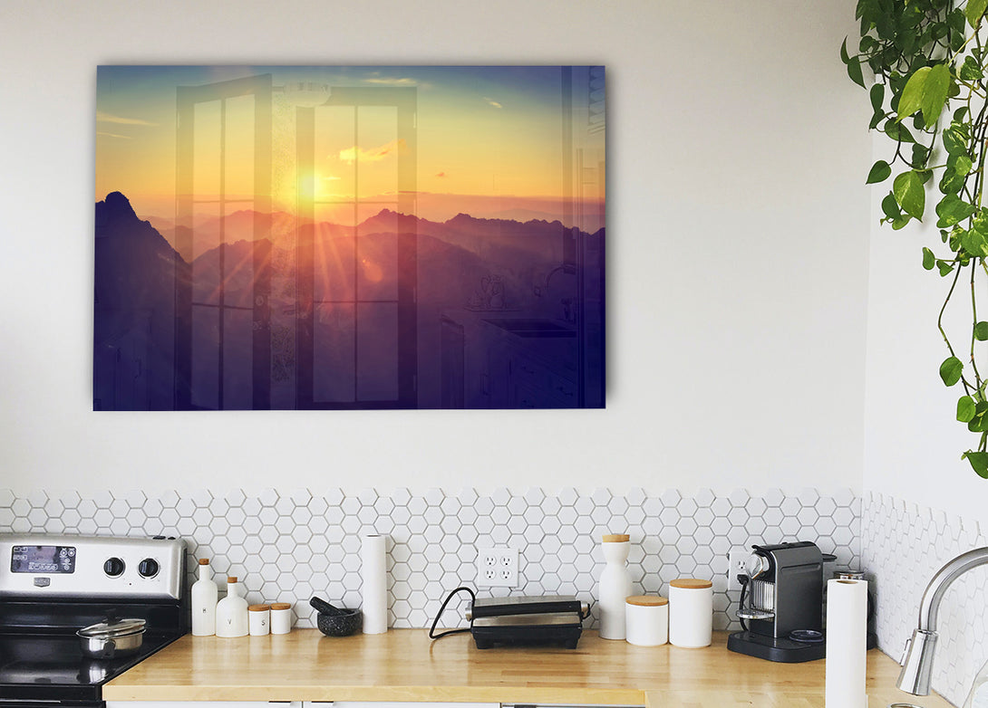 Sonnenstrahlen über den Bergen 1 Acryldruck, UV-gedruckt auf 5 mm dickes Acrylglas. Wird mit allem geliefert, was Sie zum Aufhängen an Ihre Wand benötigen.