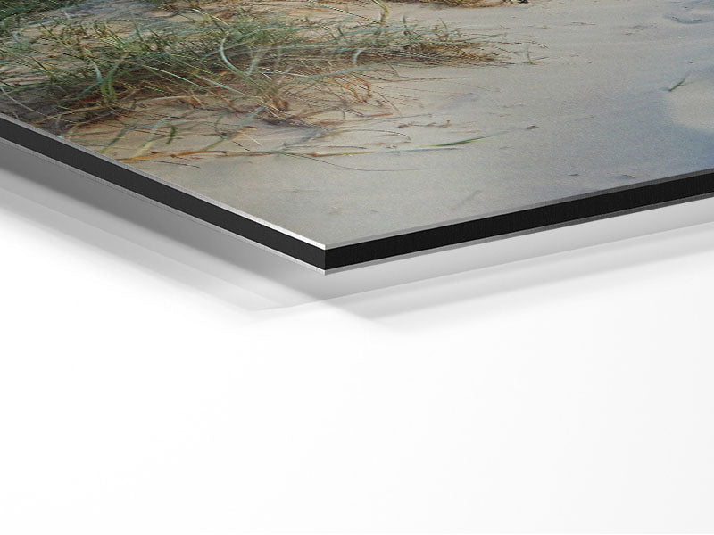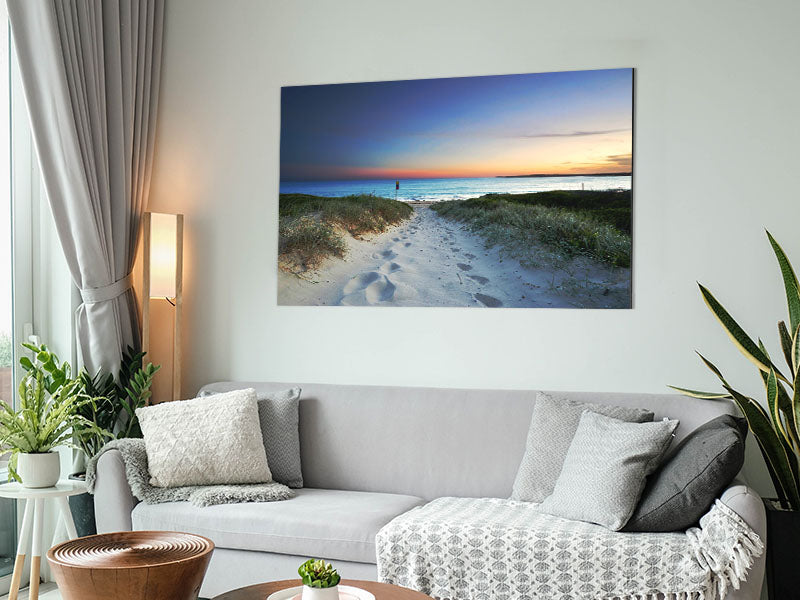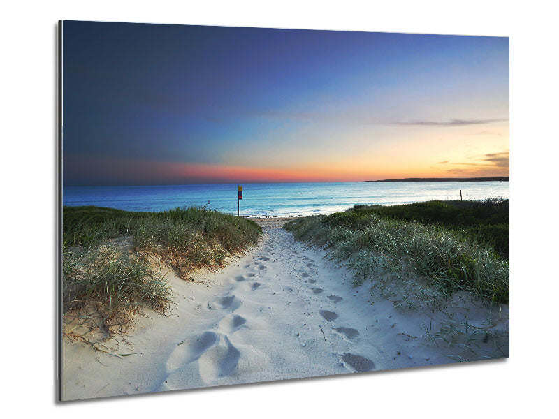 Sunrise Beach Walk Gedruckt auf gebürstetem Aluminium-Dibond. Eine moderne Art, Kunst zu präsentieren und leicht zu pflegen.