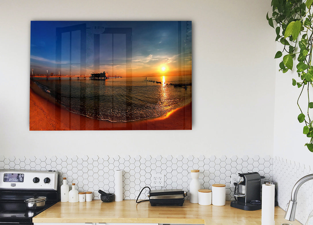 Acryldruck „Sunrise Ocean View Pier“, UV-gedruckt auf 5 mm dickes Acrylglas. Wird mit allem geliefert, was Sie zum Aufhängen an die Wand brauchen.
