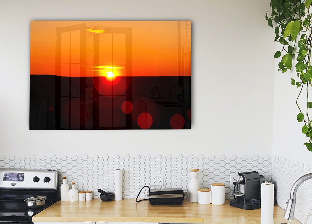 Acryldruck „Sonnenuntergang-Bokeh“, UV-gedruckt auf 5 mm dickes Acrylglas. Wird mit allem geliefert, was Sie zum Aufhängen an die Wand brauchen.