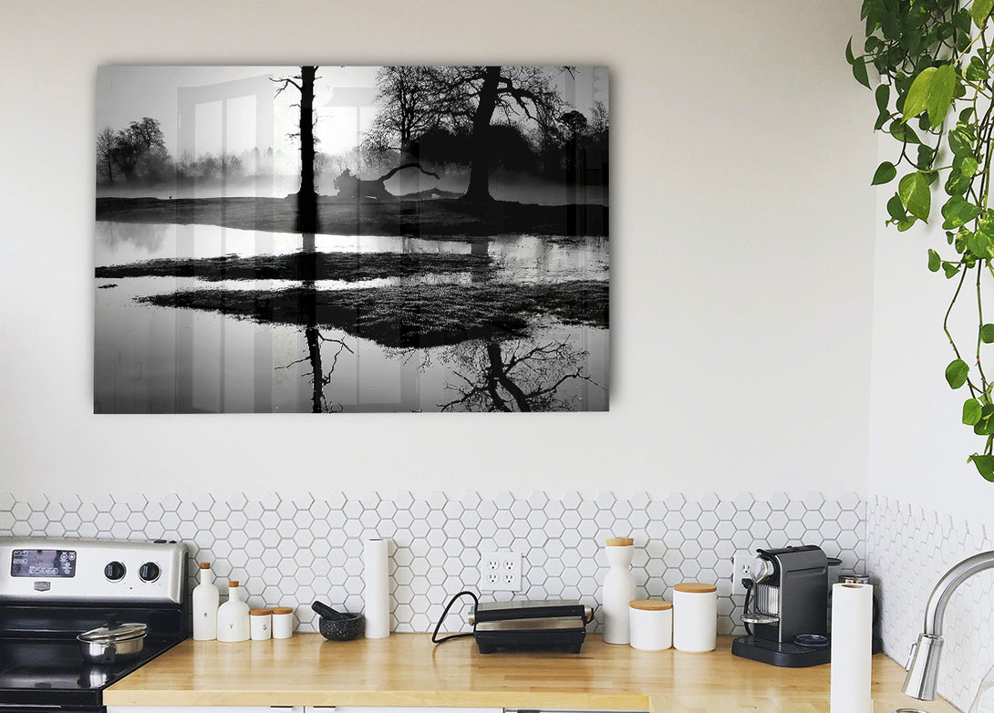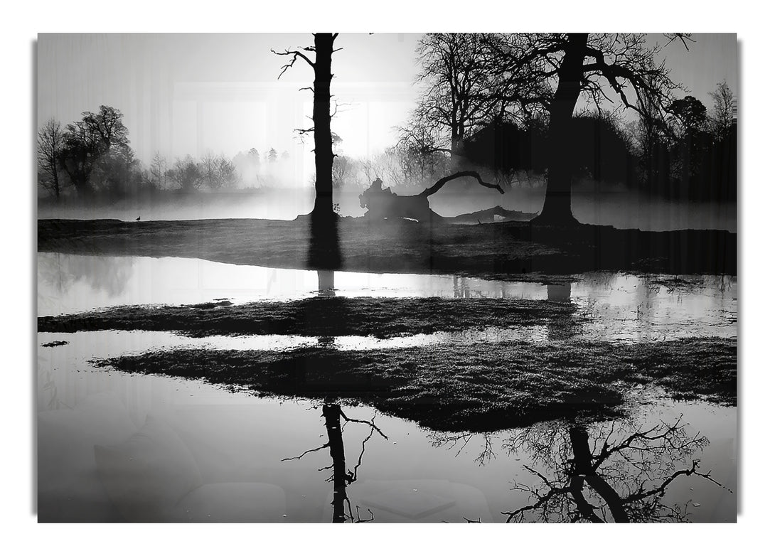 Sonnenuntergang, Waldgewässer, Schwarzweiß-Acryldruck, UV-gedruckt auf 5 mm dickes Acrylglas. Wird mit allem geliefert, was Sie zum Aufhängen an die Wand brauchen.