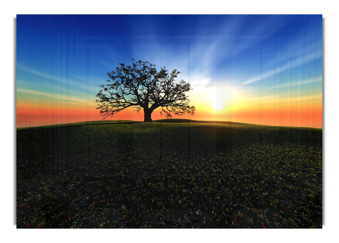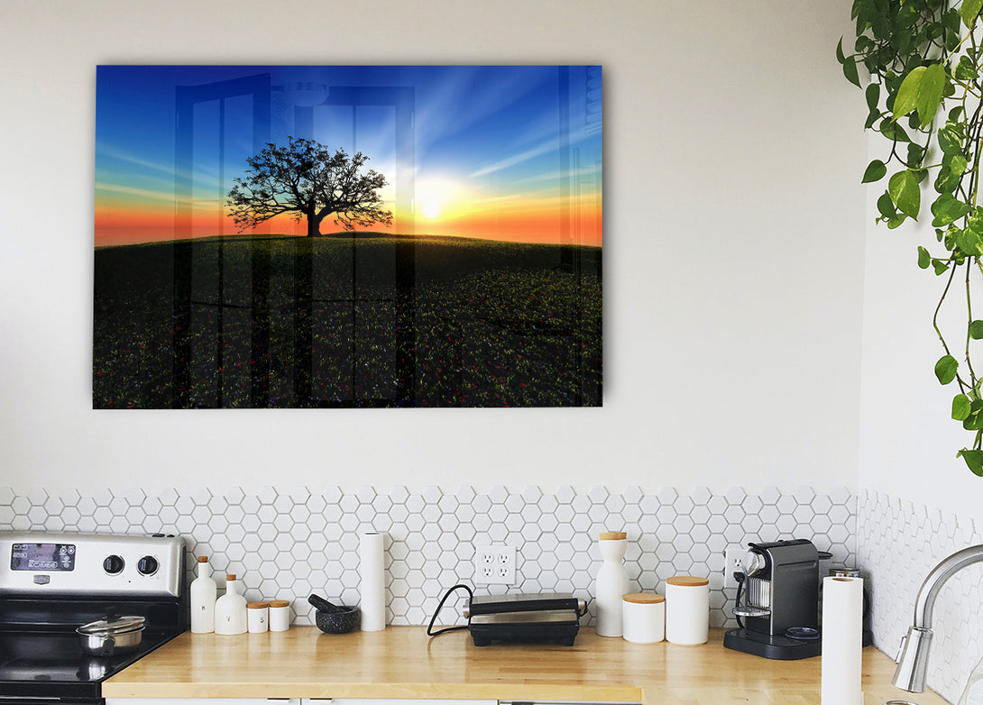 Acryldruck „Sunset Hill“, UV-Druck auf 5 mm dickes Acrylglas. Wird mit allem geliefert, was Sie zum Aufhängen an die Wand benötigen.