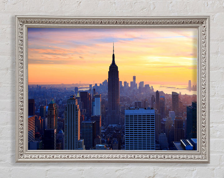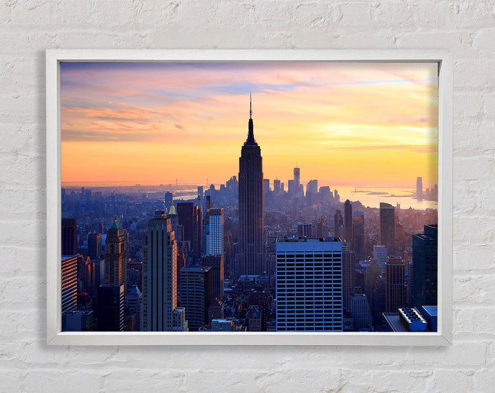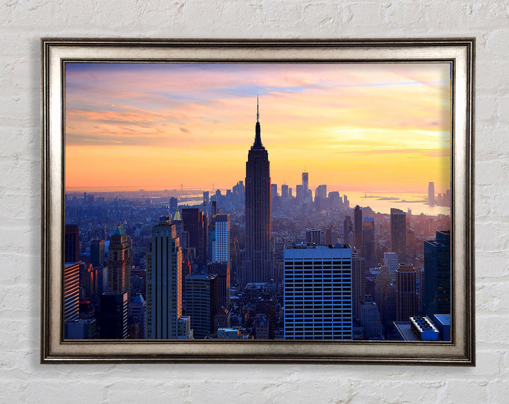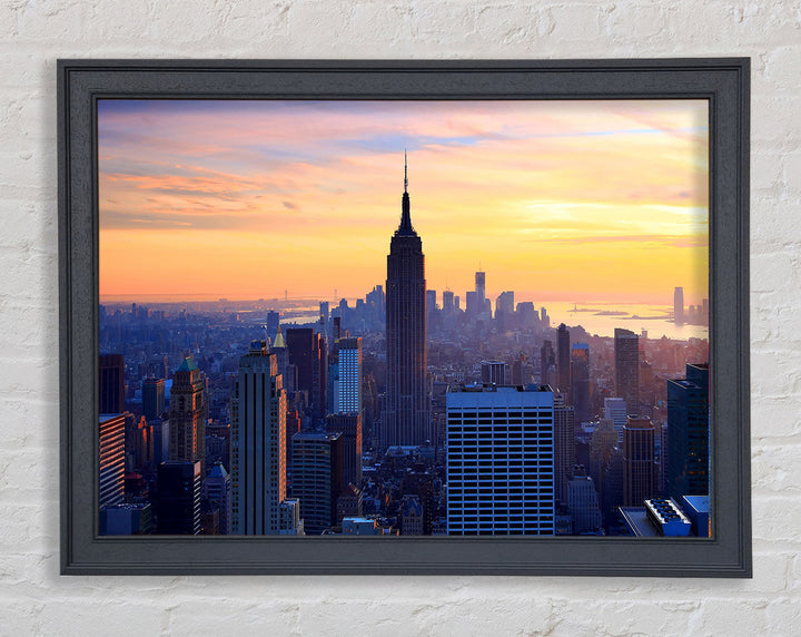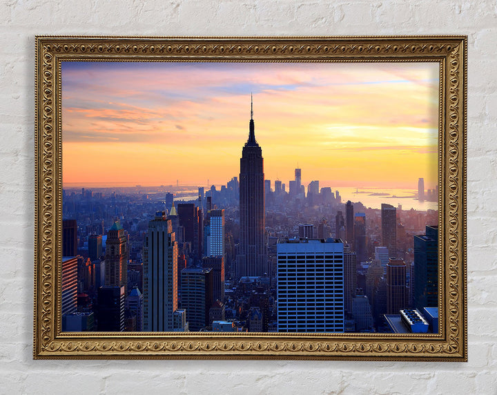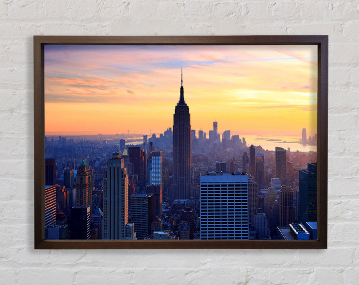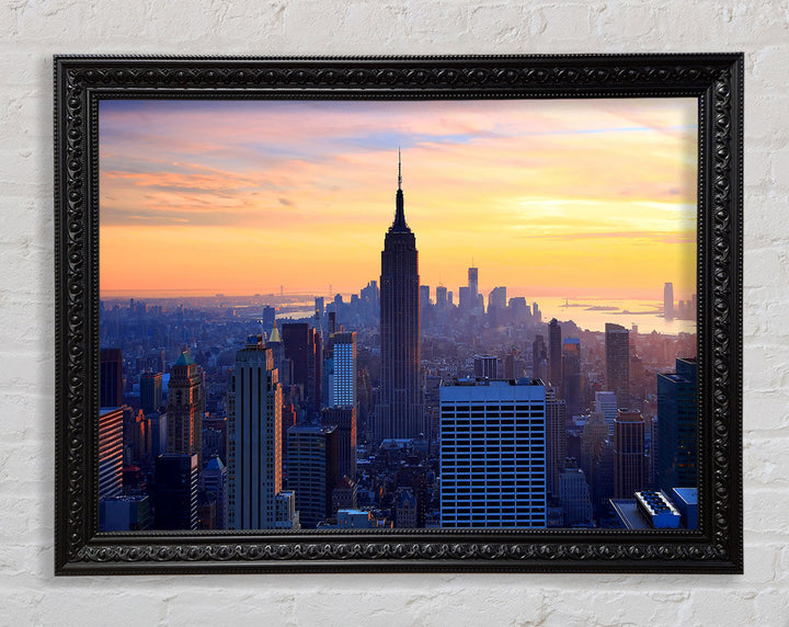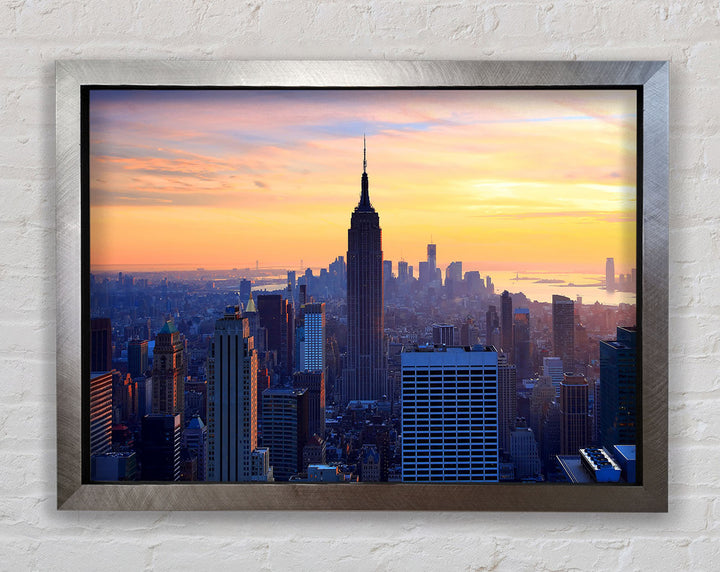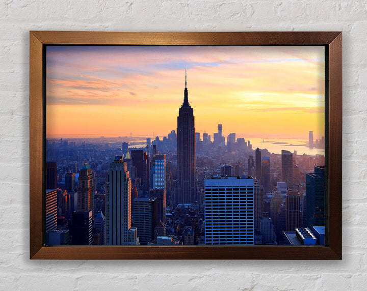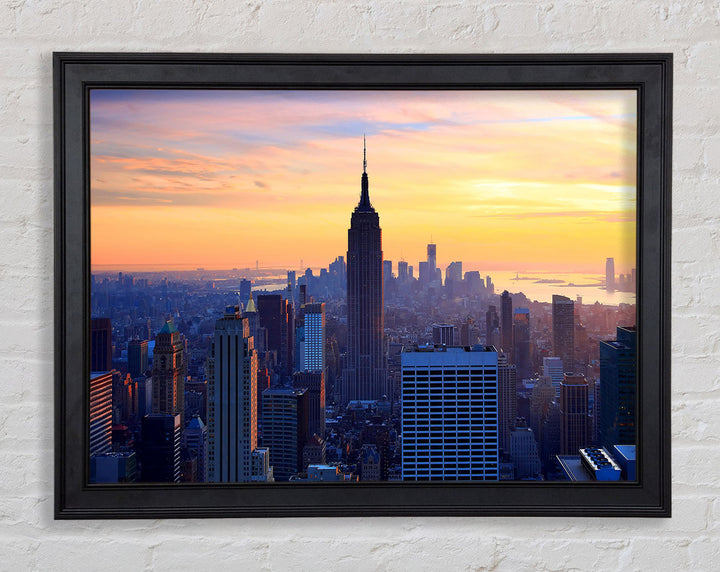 Gerahmter Druck „Sonnenuntergang über dem Empire State Building“, erhältlich in mehreren Rahmenfarben. Fertig zum Aufhängen aus der Schachtel und handgefertigt im Vereinigten Königreich.