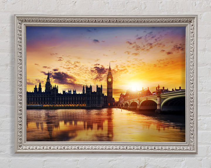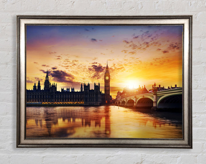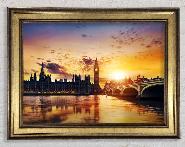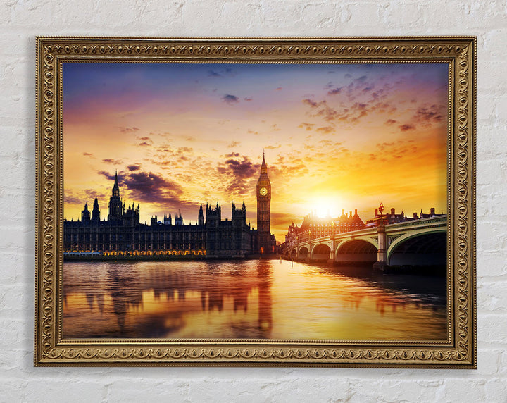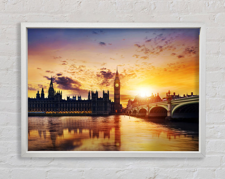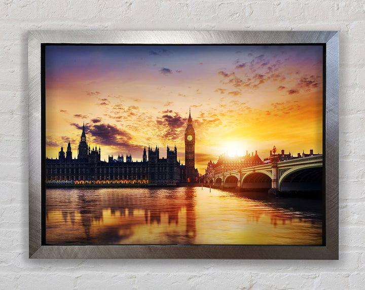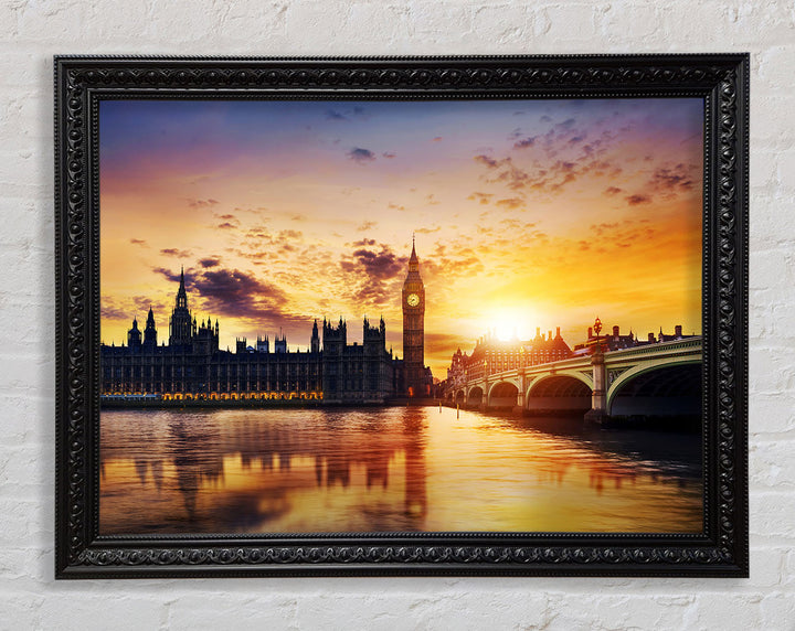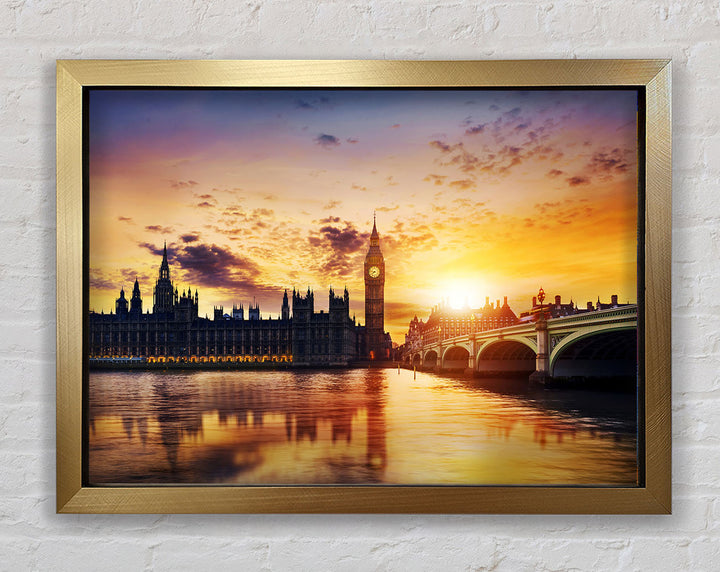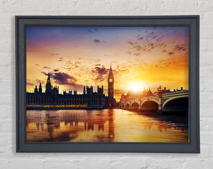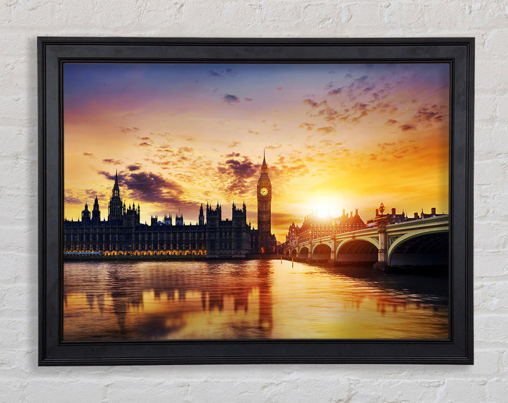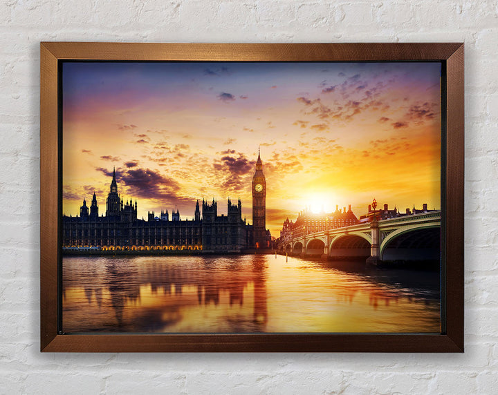 Gerahmter Druck „Sonnenuntergang über den Houses of Parliament“, erhältlich in mehreren Rahmenfarben. Fertig zum Aufhängen aus der Schachtel und handgefertigt im Vereinigten Königreich.