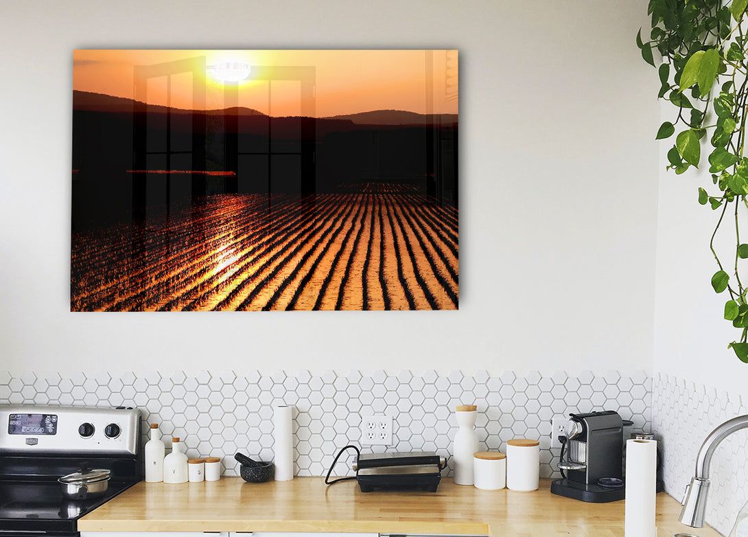 Acryldruck „Sonnenuntergang über dem Weizenfeld“, UV-Druck auf 5 mm dickes Acrylglas. Wird mit allem geliefert, was Sie zum Aufhängen an die Wand brauchen.