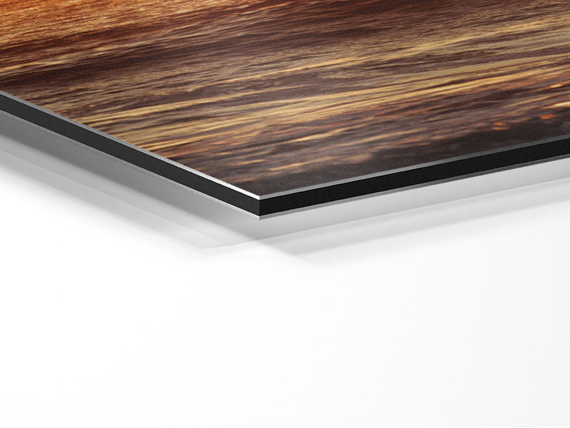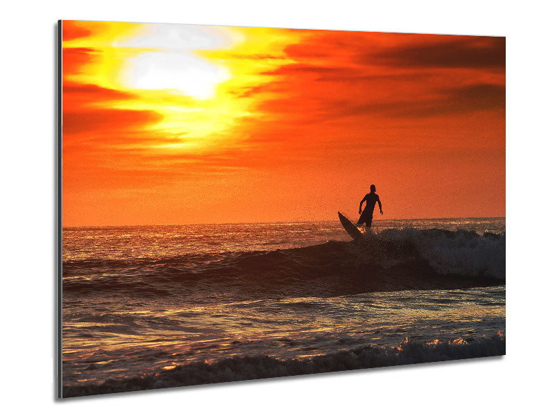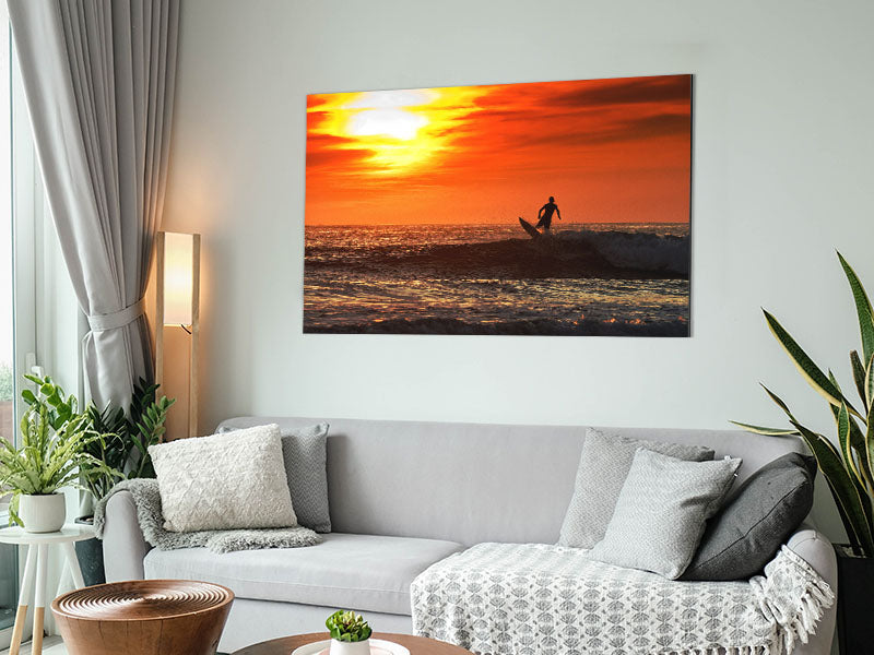 Sonnenuntergangs-Surfen. Gedruckt auf gebürstetem Aluminium-Dibond. Eine moderne Art, Kunst zu präsentieren und leicht zu pflegen.