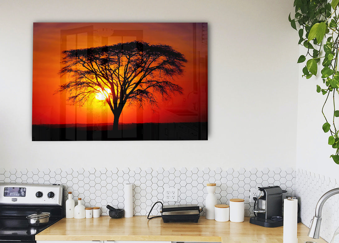 Acryldruck „Sonnenuntergang durch die Bäume“, UV-Druck auf 5 mm dickes Acrylglas. Wird mit allem geliefert, was Sie zum Aufhängen an die Wand benötigen.